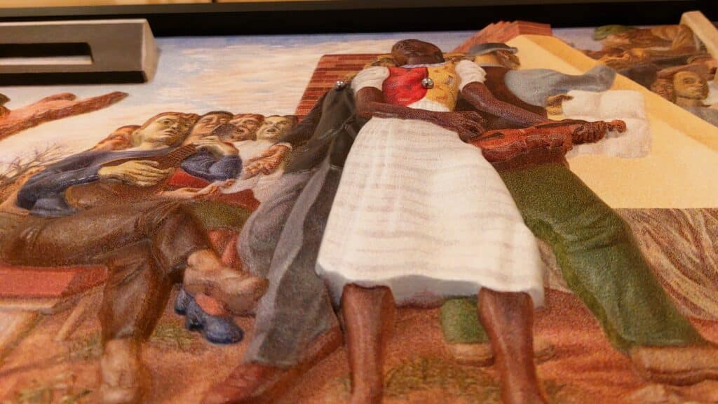 The interactive exhibit presents museum goers with a three-dimensional recreation of the artwork laid flat on a table in front of the mural. The layered relief adds a realistic quality to the art. Every bumpy rock, sharp-edged stair and rippled fabric is brought to life, making it feel as though the viewer just interrupted the movement of the scene’s subjects.