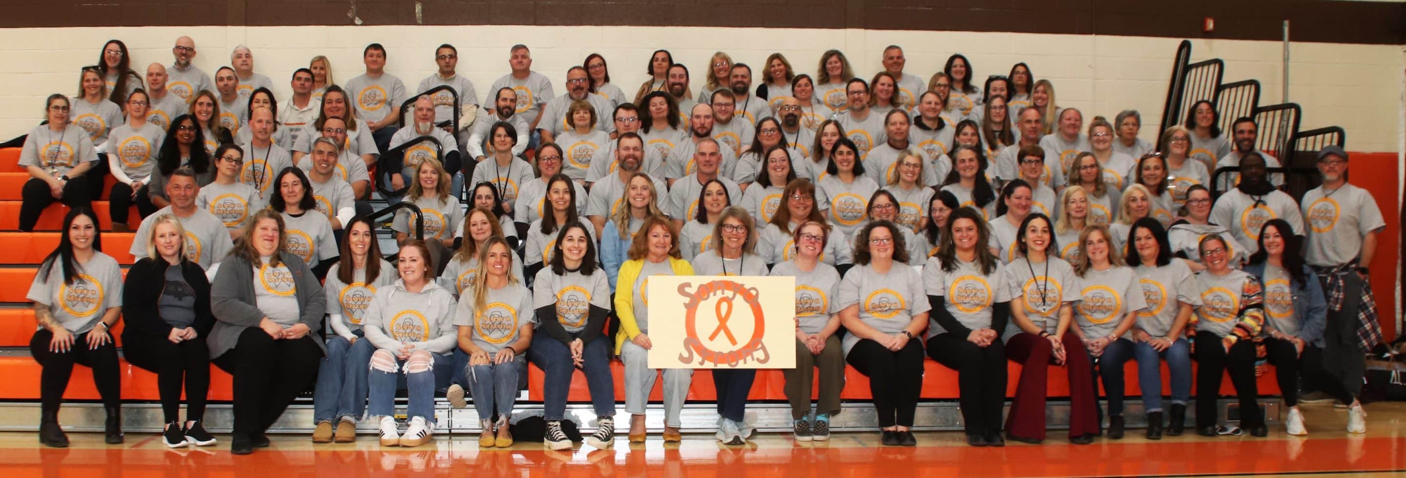 AGAWAM – Agawam educators gathered in the gym at the high school on Nov. 4 to show their support for AHS paraprofessional Sonya Johnson by having a photo taken of themselves wearing “Sonya Strong” T-shirts. The photo was sent to Johnson, who is battling cancer, along with the poster that was signed by everyone in the photo.