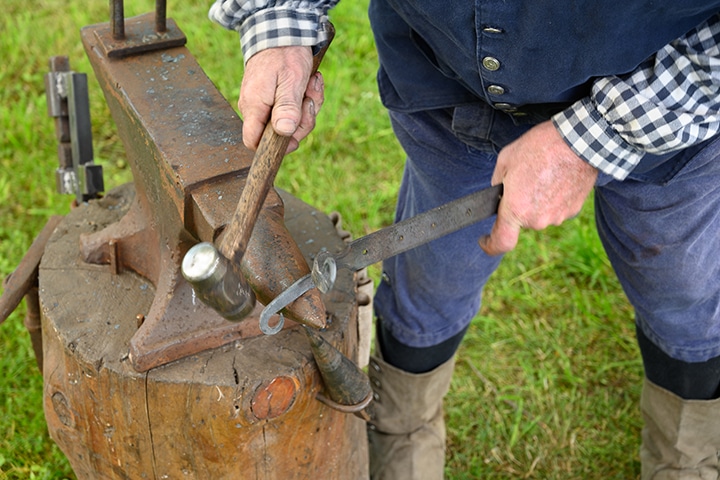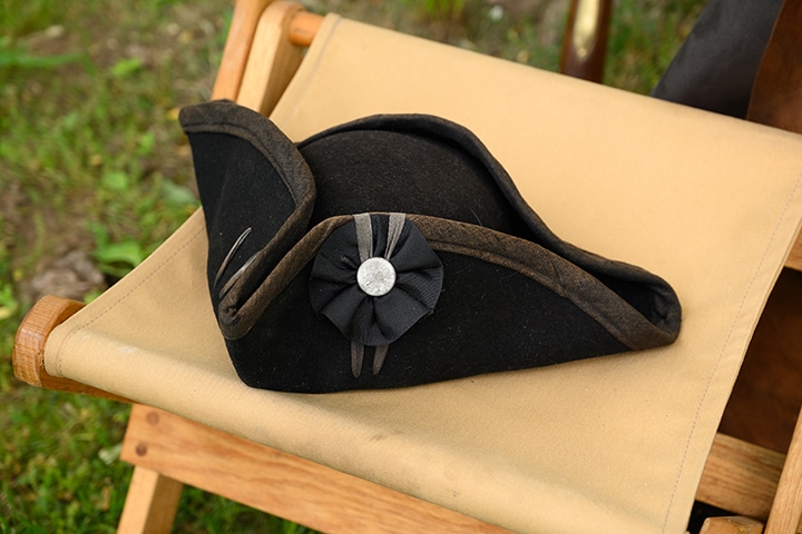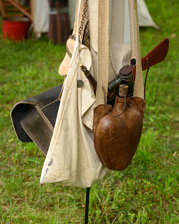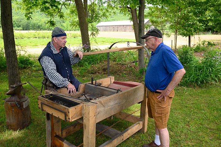 Top row, from left: Eastern States Exposition blacksmith John Richard chats with Mark Meiers, of Feeding Hills, at the 25th Continental Regiment Revolutionary War demonstration hosted by the Agawam Historical Association at the Thomas Smith House in Feeding Hills on May 25. Joe Potter of the Agawam Historical Association stands with Kathy Keenan of the 25th Continental Regiment. Blacksmith John Richard hammers a part at the 25th Continental Regiment demonstration May 25. Bottom row from left: Revolutionary War items displayed during the demonstration included a canteen. A Revolutionary War-era tricorn hat.