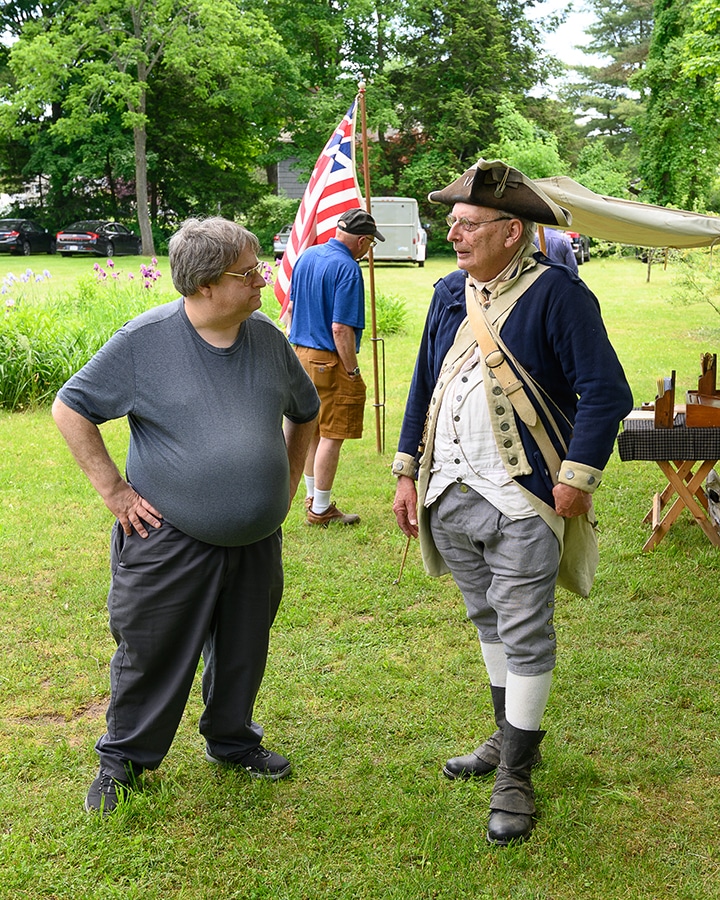 Mark Payson discusses Revolutionary War history with Rob Keenan of the 25th Continental Regiment during an Agawam Historical Association event in May.