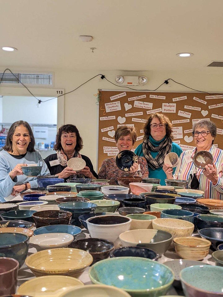 Empty Bowls volunteers in spring 2023 showcase a sampling of 700 bowls donated by local potters. Left to right: Leslie Nyman, Deborah Swan, Adrienne Levine, Cammie McGovern and Susan Crim.