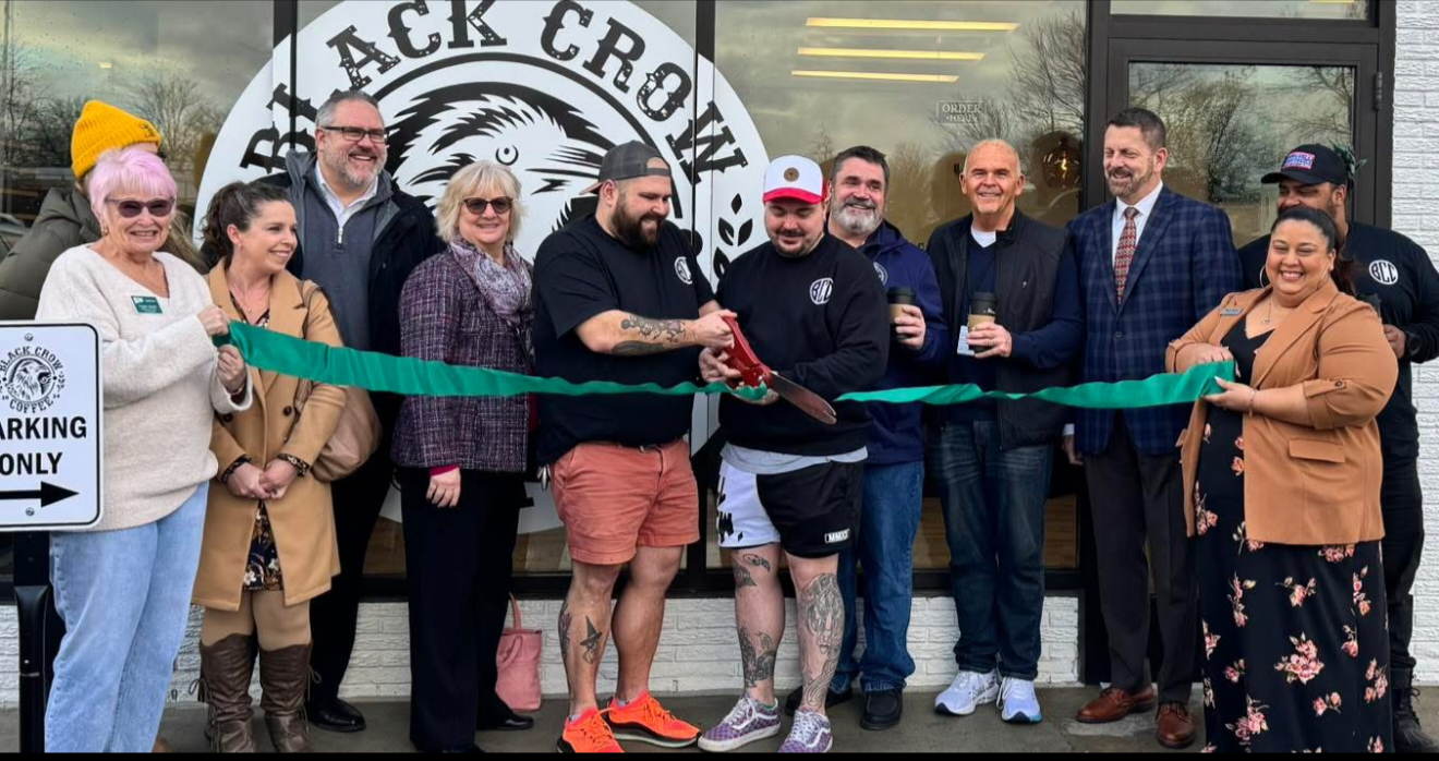 Black Crow Coffee owner Anthony Barbosa (center left) cuts the ribbon at his coffee shops grand opening.