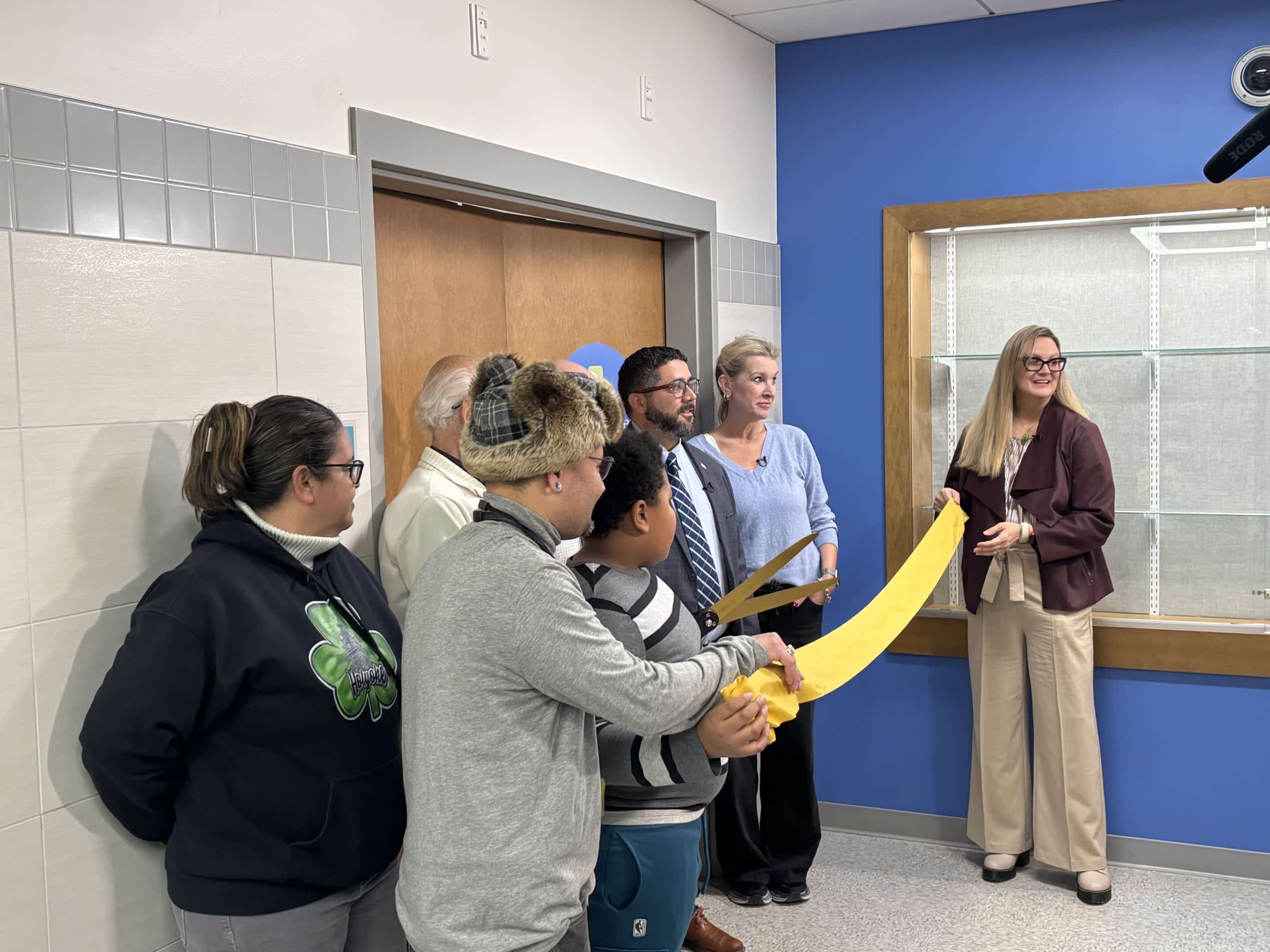 Interim Superintendent Anthony Soto along with members from Holyoke Public Schools and Catie’s Closet gather to open Catie’s Closet at Peck Middle School.