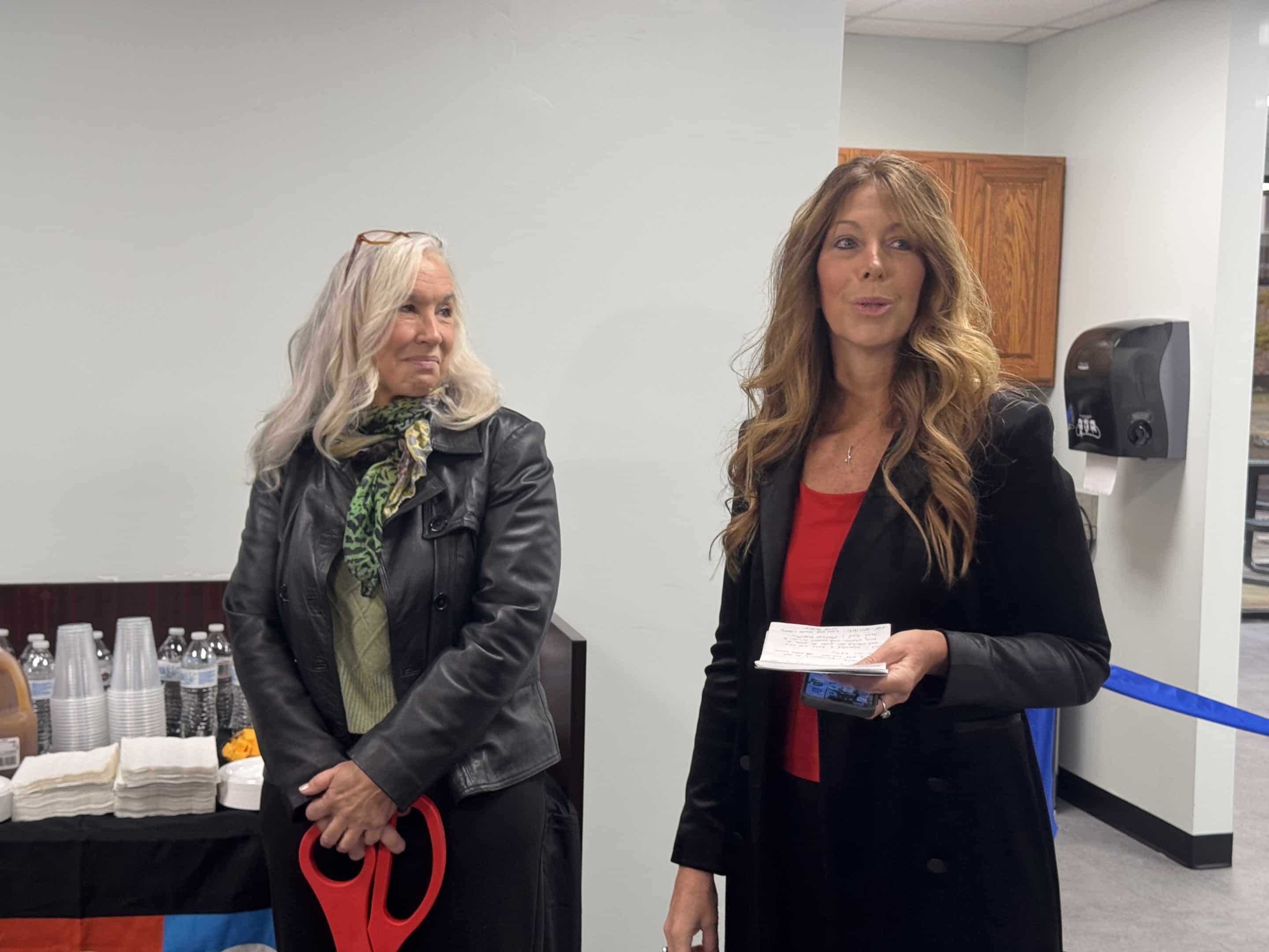 CSO Vice President of Housing and Homeless Services Jane Banks (left) and President and CEO Karin Jeffers (right) give opening remarks to the community gathered before providing a tour of the new shelter.