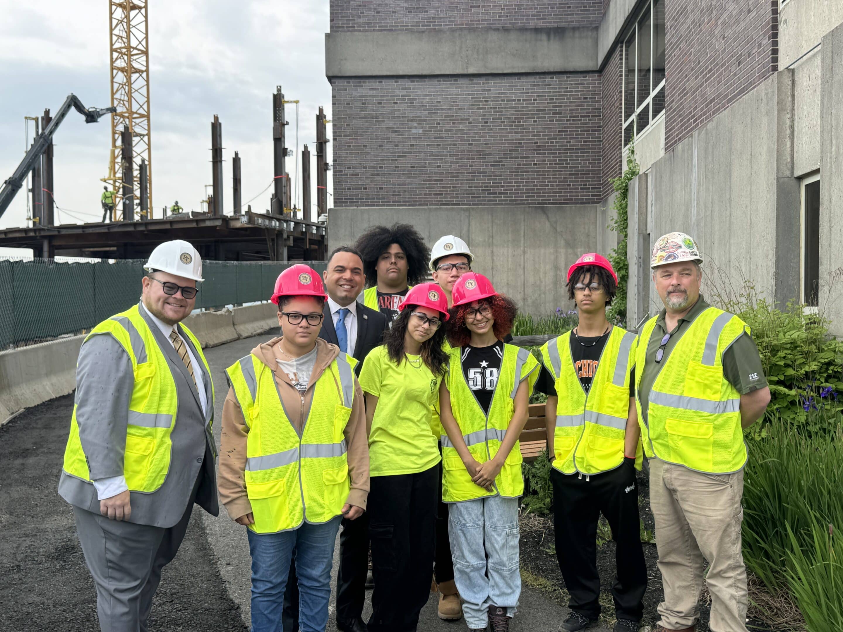 Holyoke Mayor Joshua Garcia poses with 11th grade carpentry students from Dean Tech following a tour of the Holyoke Veterans Home construction site.