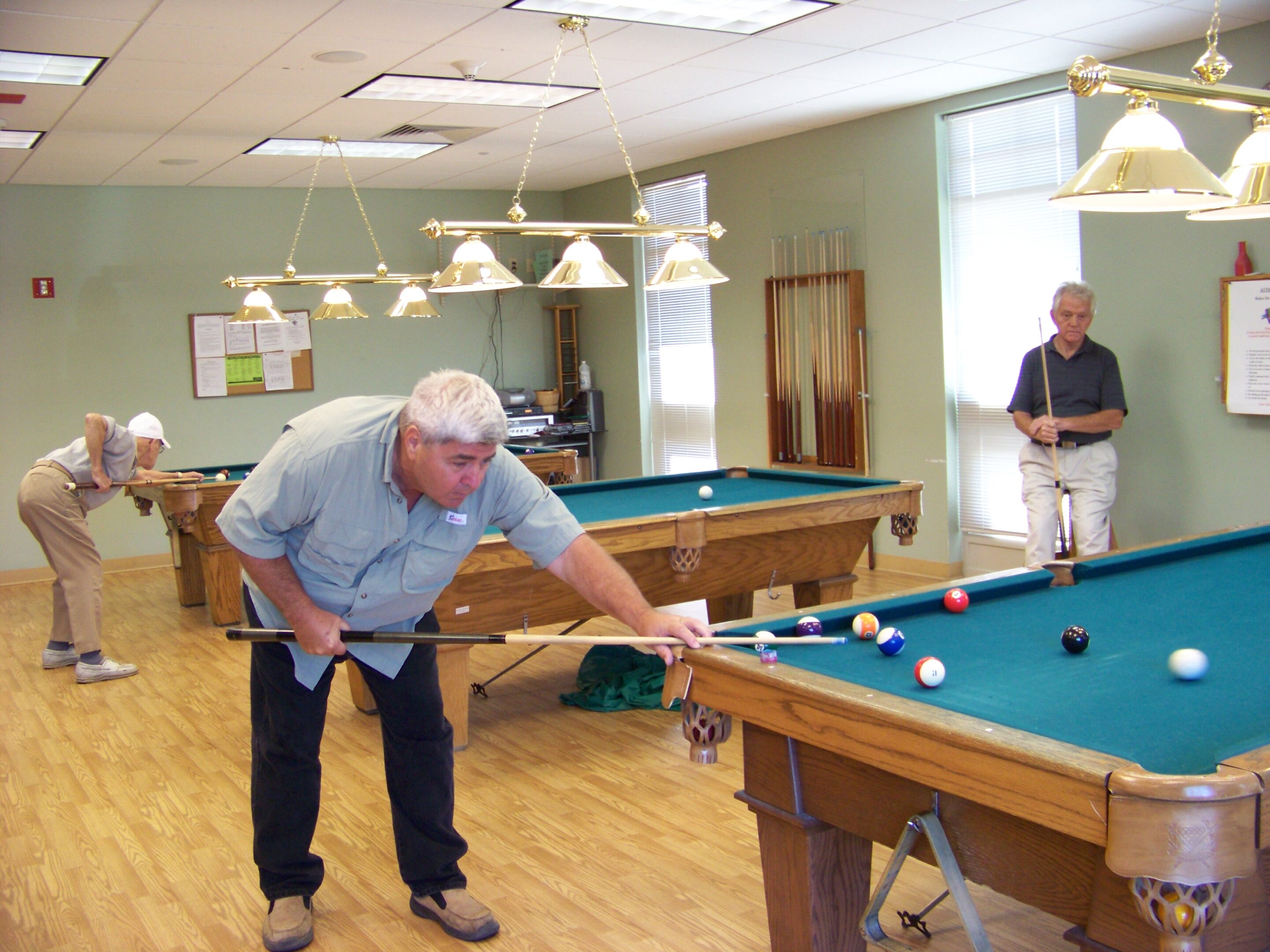 Seniors playing pool in the game room at the Enfield Senior Center.