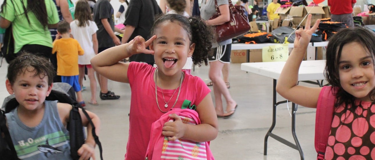 Children pictured with their new school supplies at the 2023 backpack drive.