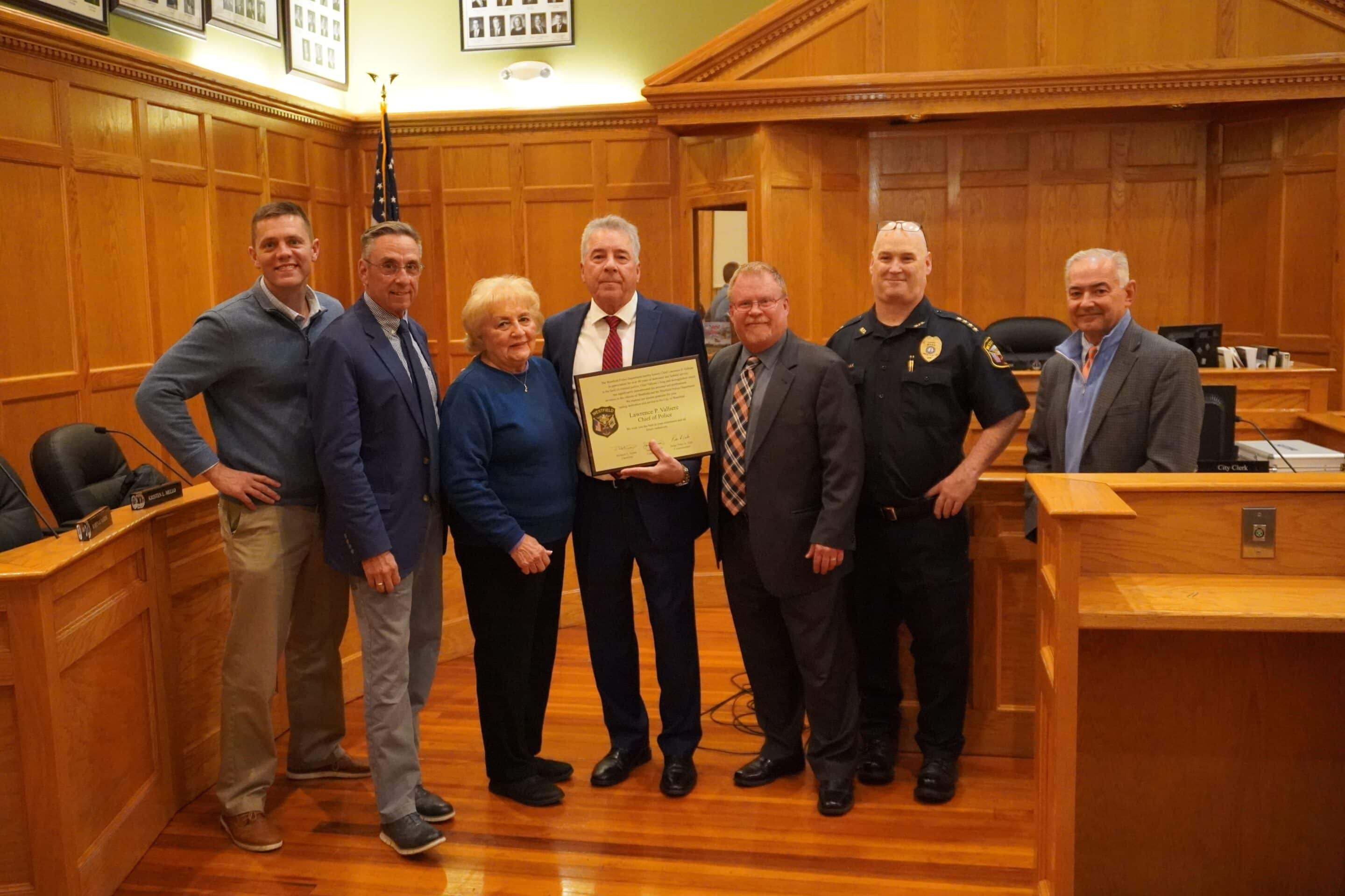 WESTFIELD — As former Police Chief Lawrence Valliere stood in the City Council Chambers after being recognized by state and local officials for his 41 years of police work, he recounted a conversation with another former Westfield police chief, John Camerota, with his friends, family and mother looking on.