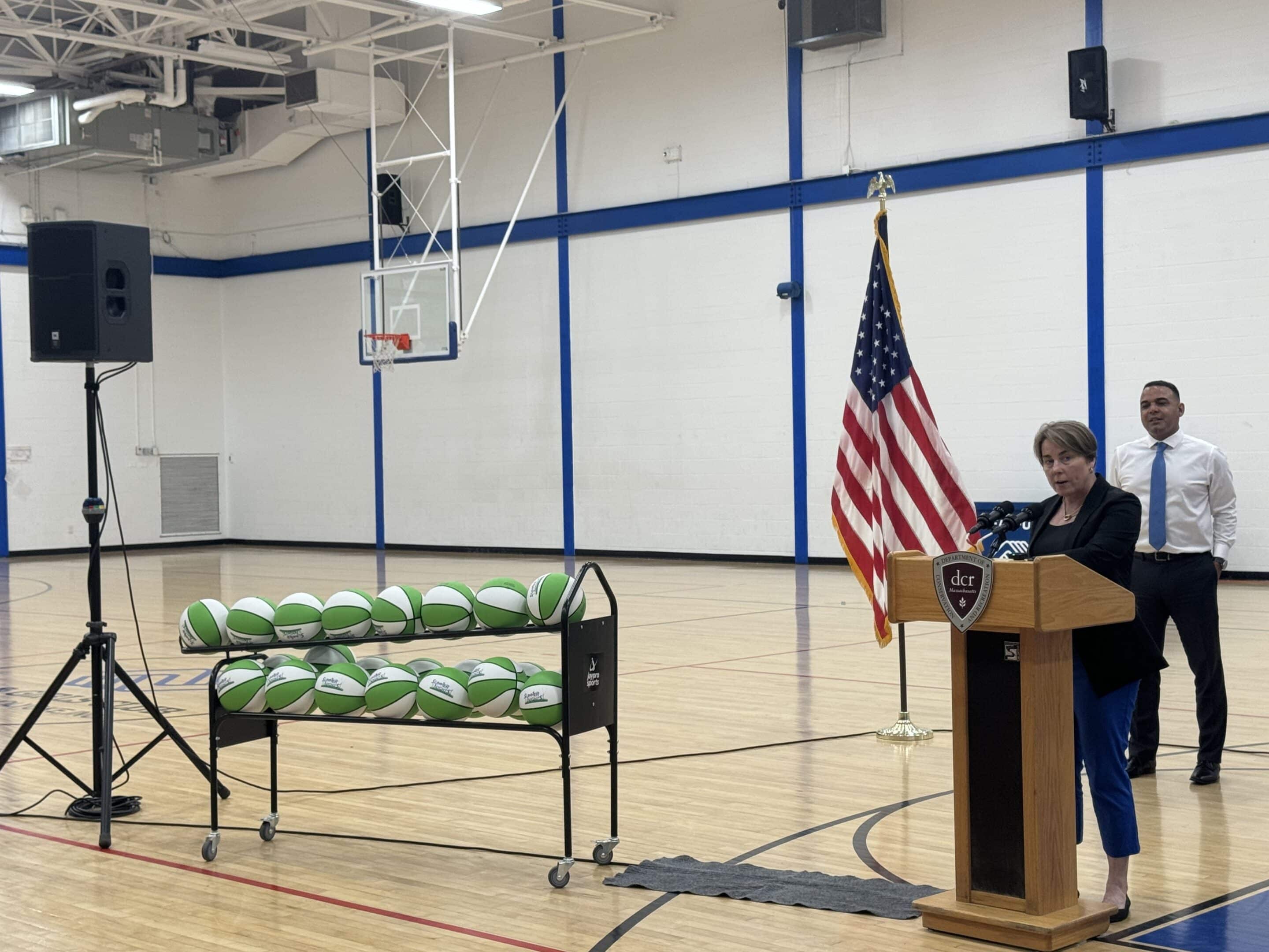 Healey, joined by city and state officials joined a packed crowd inside the gymnasium and spoke to children and families about the Summer Nights program.