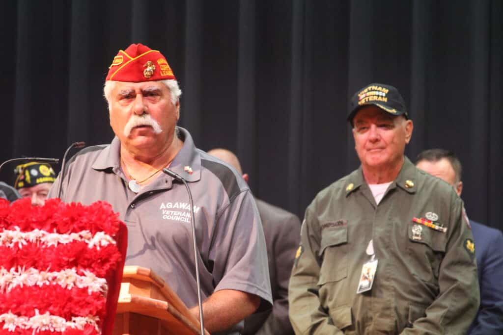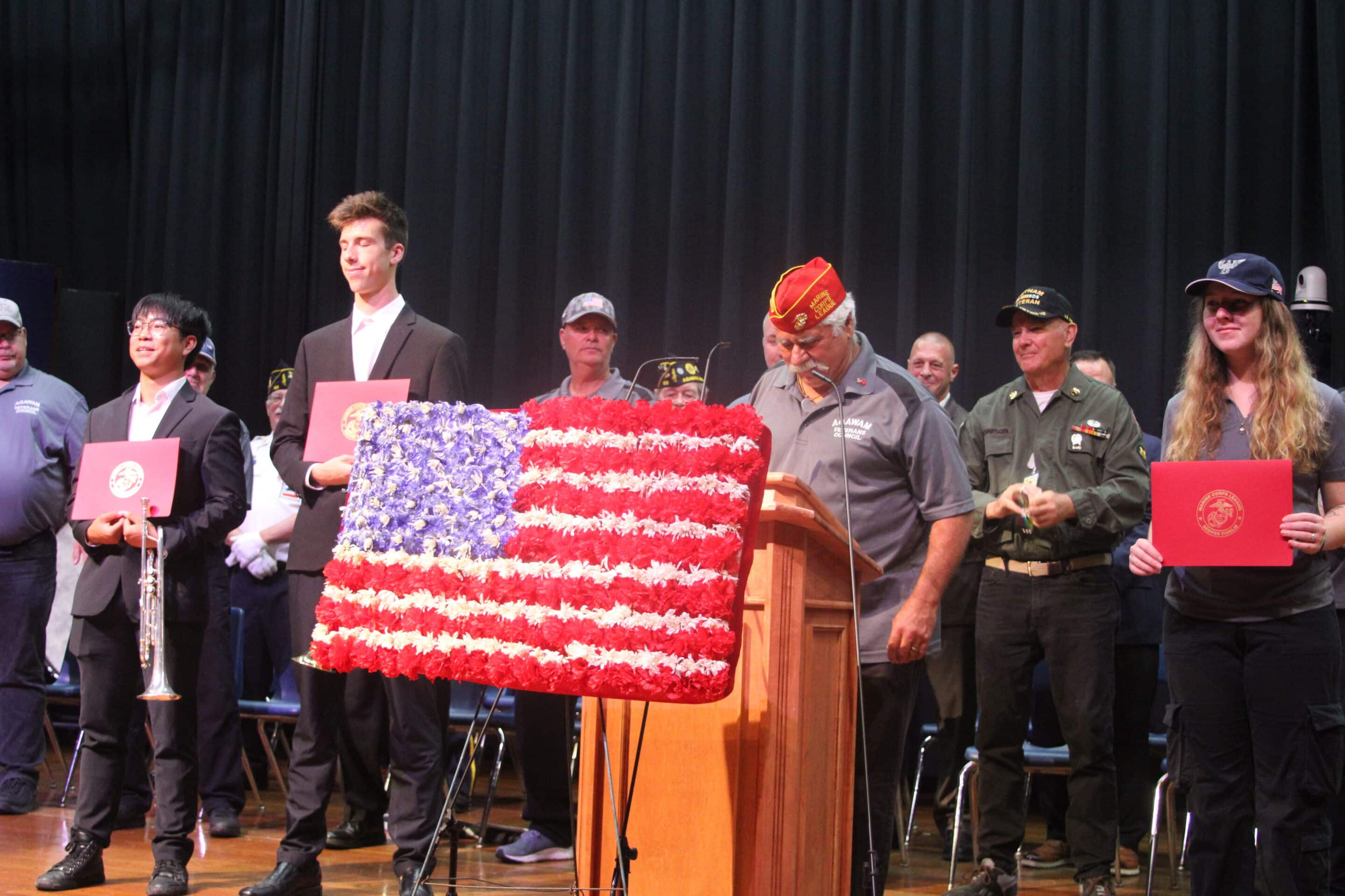 Veterans Council Chair Aldo Mancini, behind the podium, awarded three Agawam High School students — Nick Nguyen, Gabe Rua and Shannon Newsome — certificates of appreciation for their work with veterans.