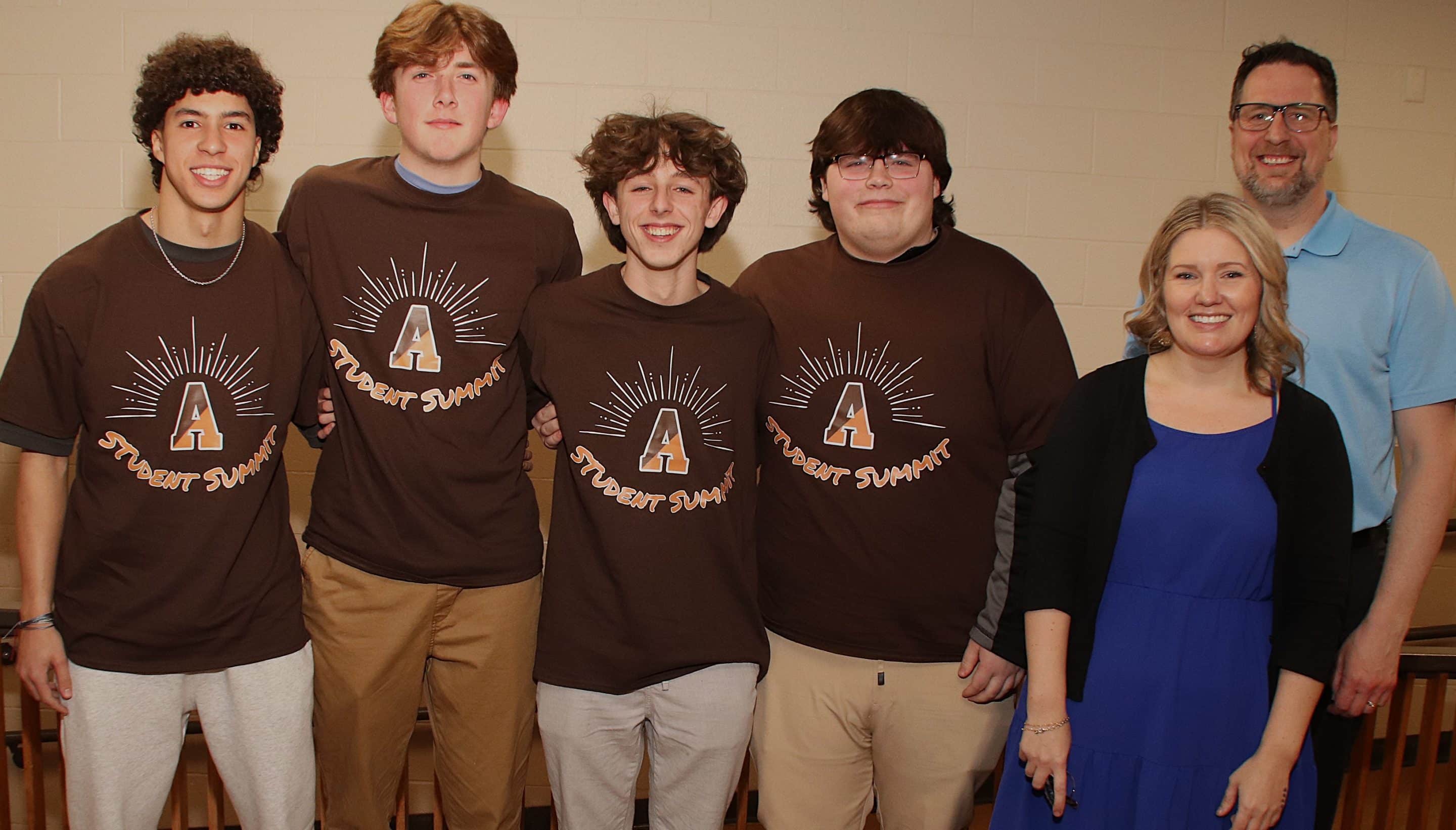 Student facilitators at a recent AHS Student Summitt (left to right) Dawood Atanane, Andrew Bagley, Connor Glynn and Anthony Norman with AHS teachers Nikali Benkert and Mary Lynn Hunter. The summit brought together teachers and students to discuss creating a new education plan for AHS.