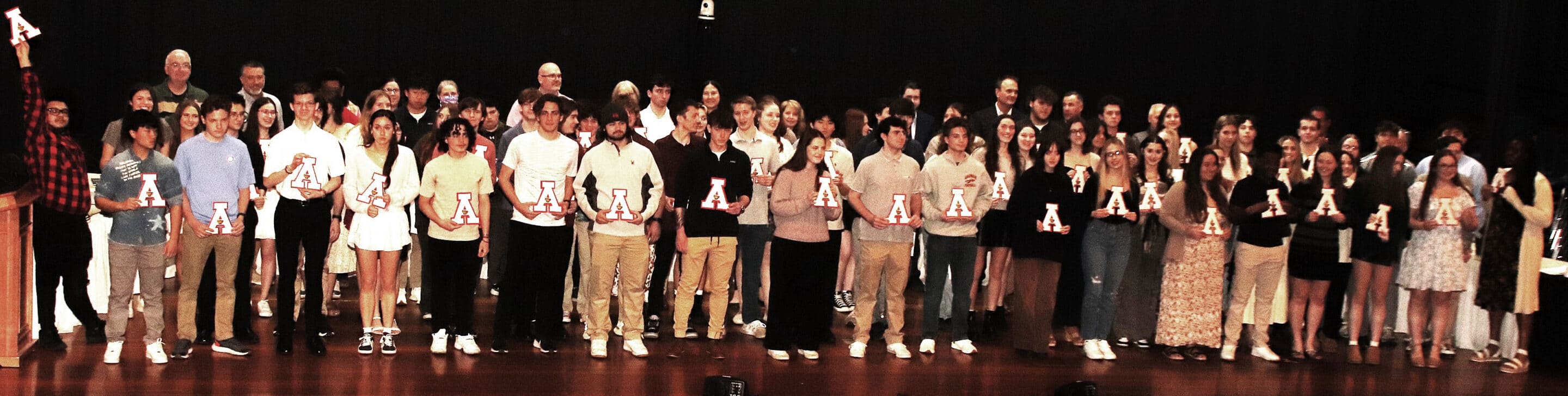 After receiving their Academic Award A award at the March 25 School Committee meeting, AHS seniors gathered on stage at the AJHS for a group photo. About 55% of this year’s 228 seniors received the award for academic excellence.