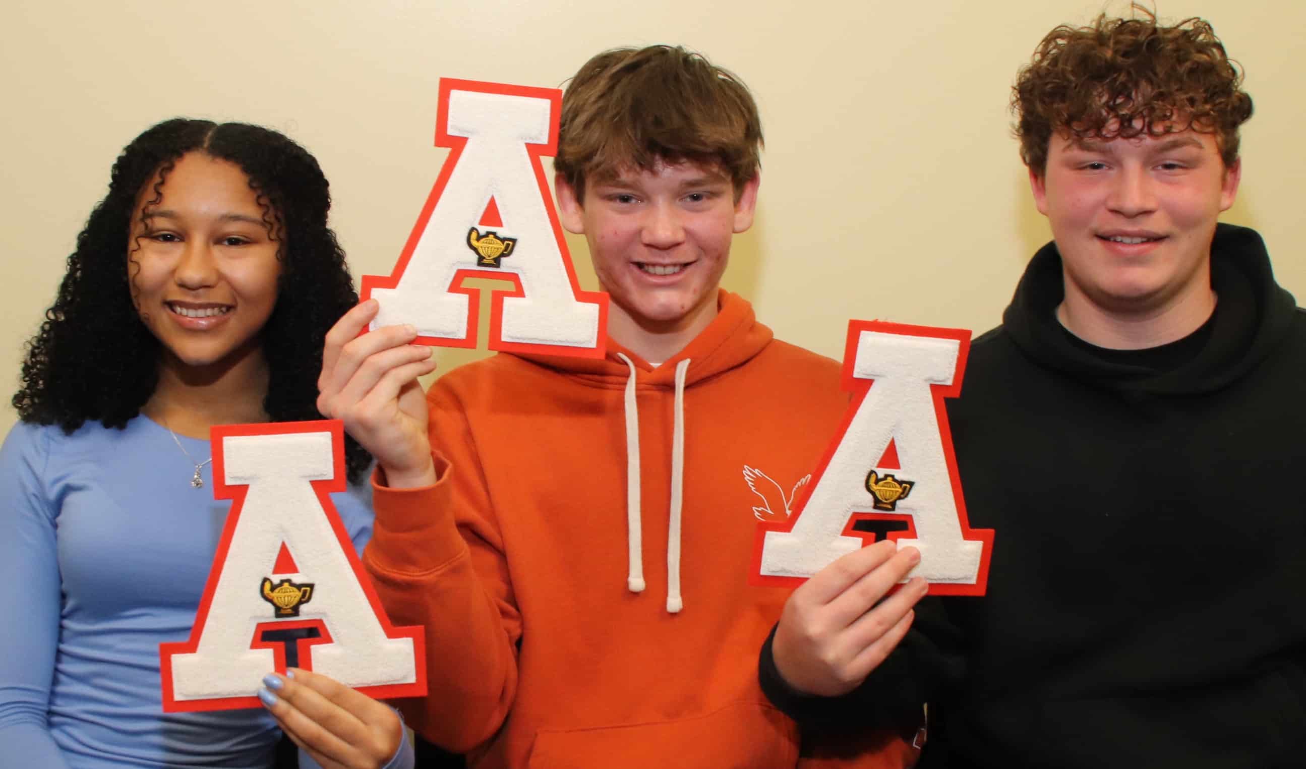 Agawam High School seniors, from left, Destiny Bullock, Colin Smith and Shane Typrowicz proudly show off their Academic A letters at the March 26 School Committee meeting.