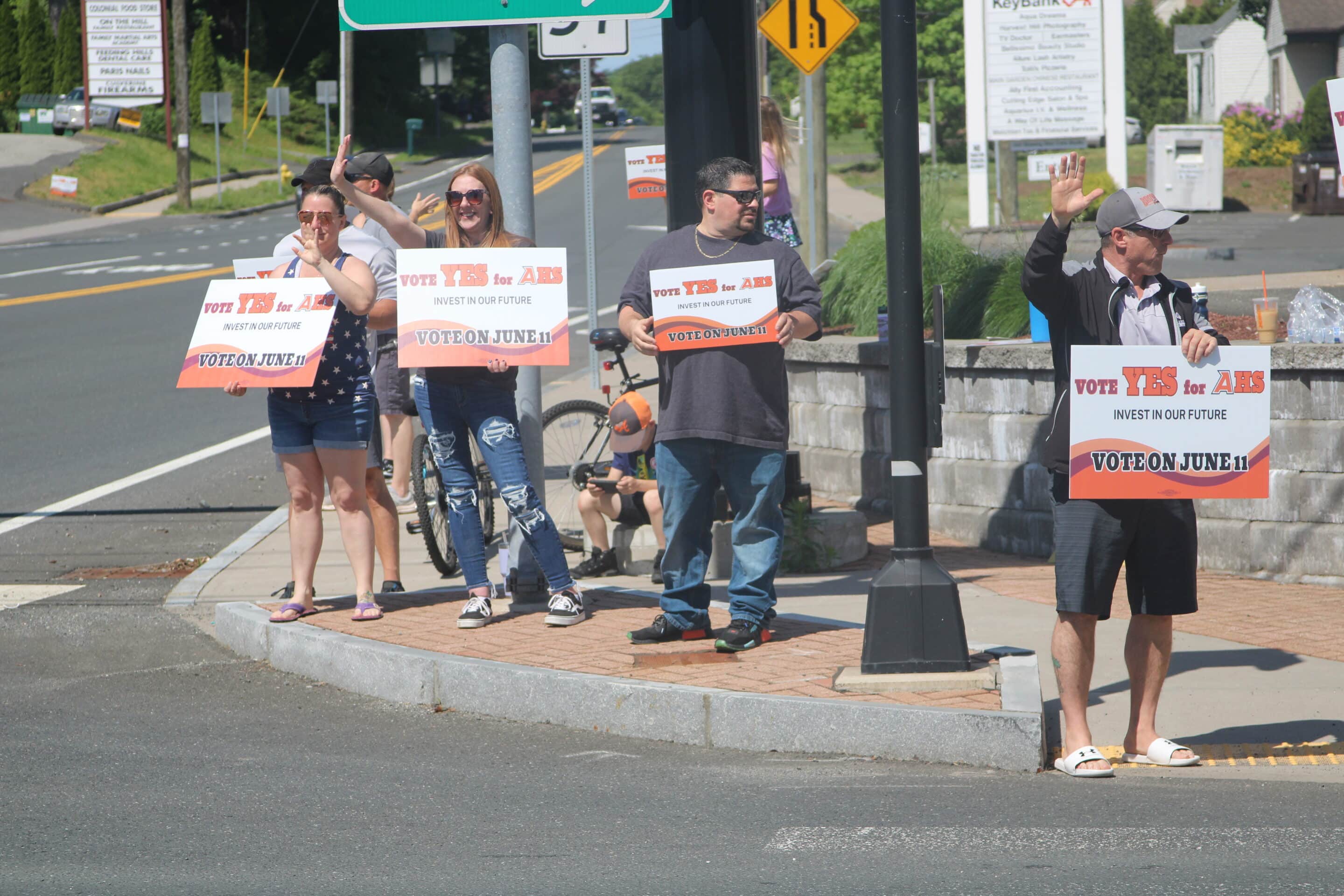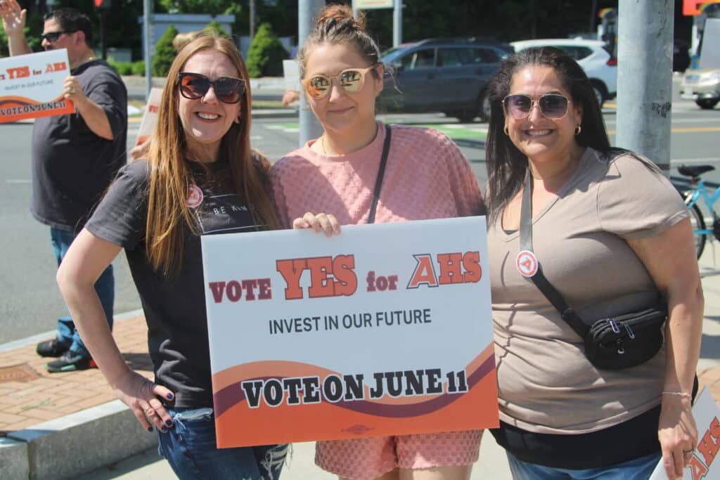 Vote Yes for AHS Committee members Deborah Paquette, Aleksandra Wrobel and Jessica Schmaelzle attend a sign standout on May 25 in Feeding Hills Center in support of a new high school.