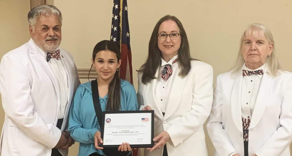 This year’s essay theme was “What the Bill of Rights Means to Me.” The contest is judged in four separate grade levels, grades 5-8. It starts at the local level and then progresses through district and state levels before ending with the naming of the national winners in July. The Westfield-West Springfield lodge had two winners at the state level.