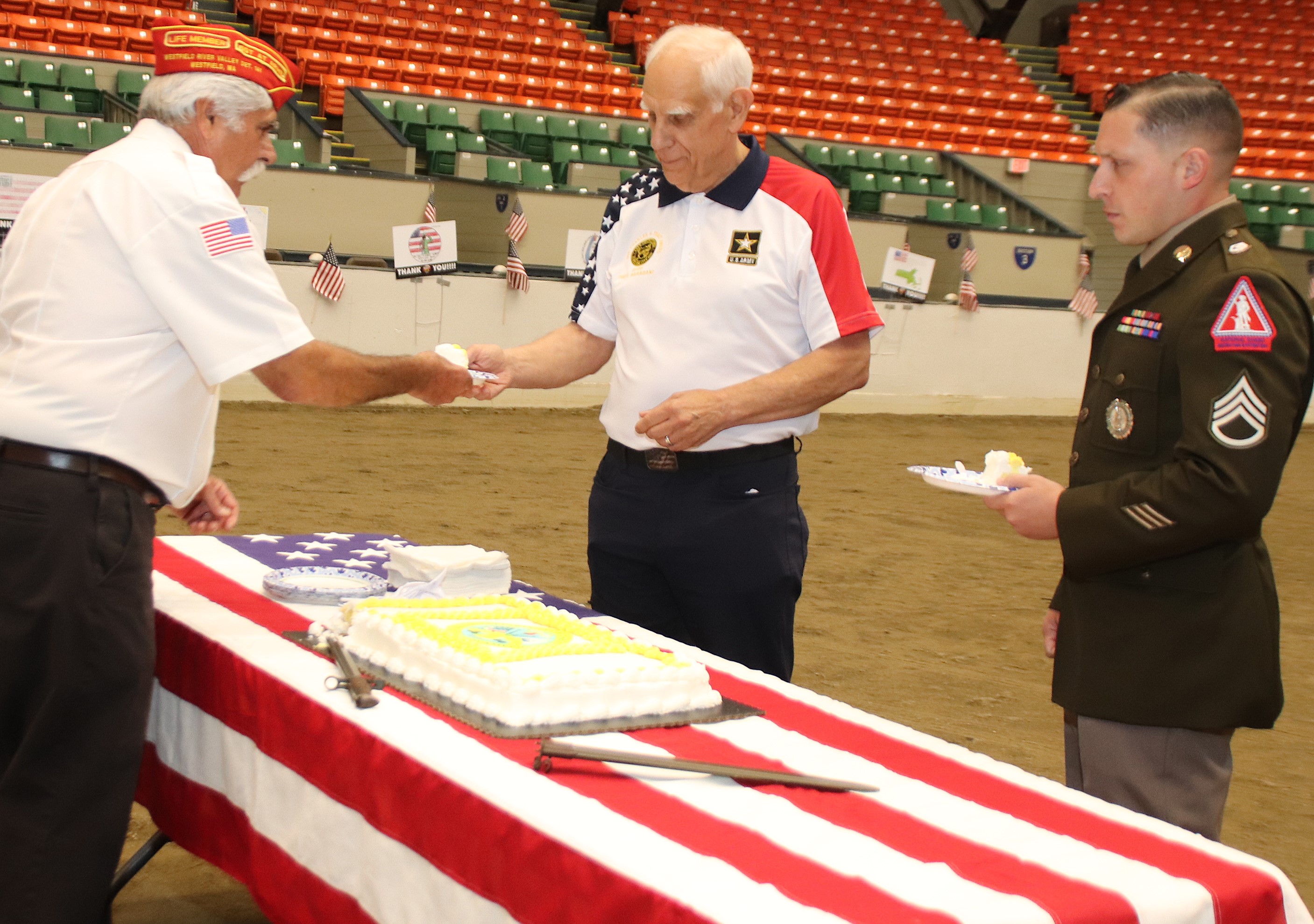Another military tradition shown to students was a special cake cutting ceremony that involved the oldest and youngest Army veterans at the program. Together, Paul Barabani — the oldest vet — and Staff Sgt. Jonathan Peloquin, the youngest vet, cut a birthday cake that honored the founding of the Army. The ceremony symbolized the passing of knowledge and experience and leadership from one generation of soldiers to the next.