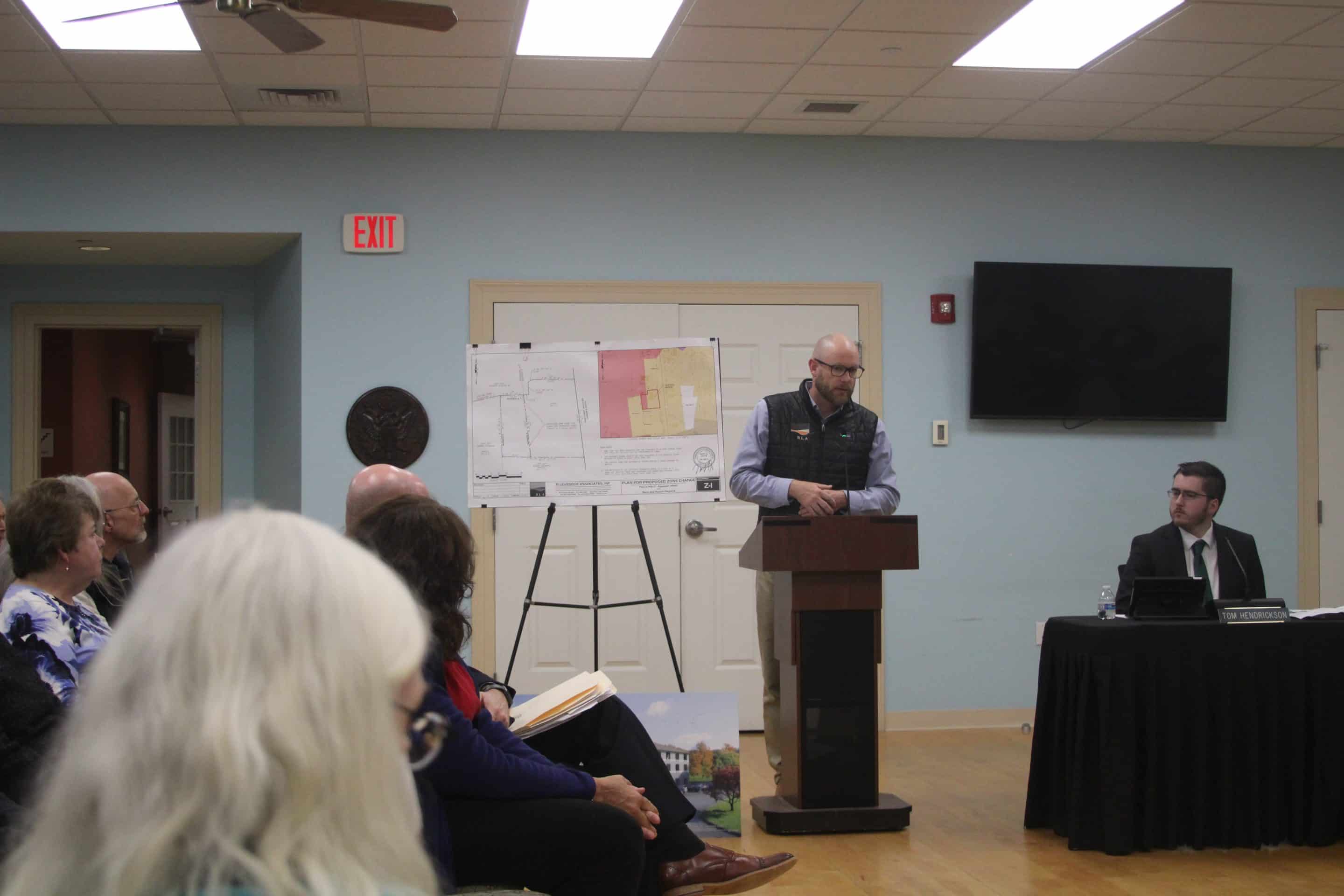 Rob Levesque of R. Levesque Associates, representing Shield Hotels, presents the proposed zone change at an April 1 public hearing.