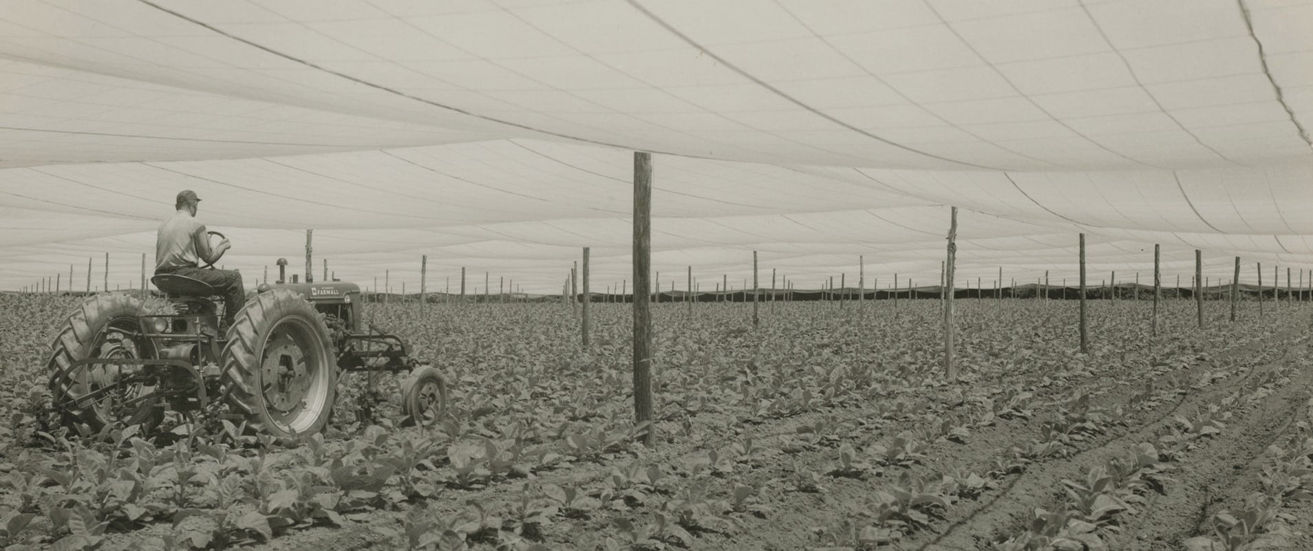 This photo provided by the Agawam Historical Association shows an Agawam farmer cultivating his crop of shade tobacco. The association is hosting a talk on shade tobacco history August 24 at the Thomas Smith House.