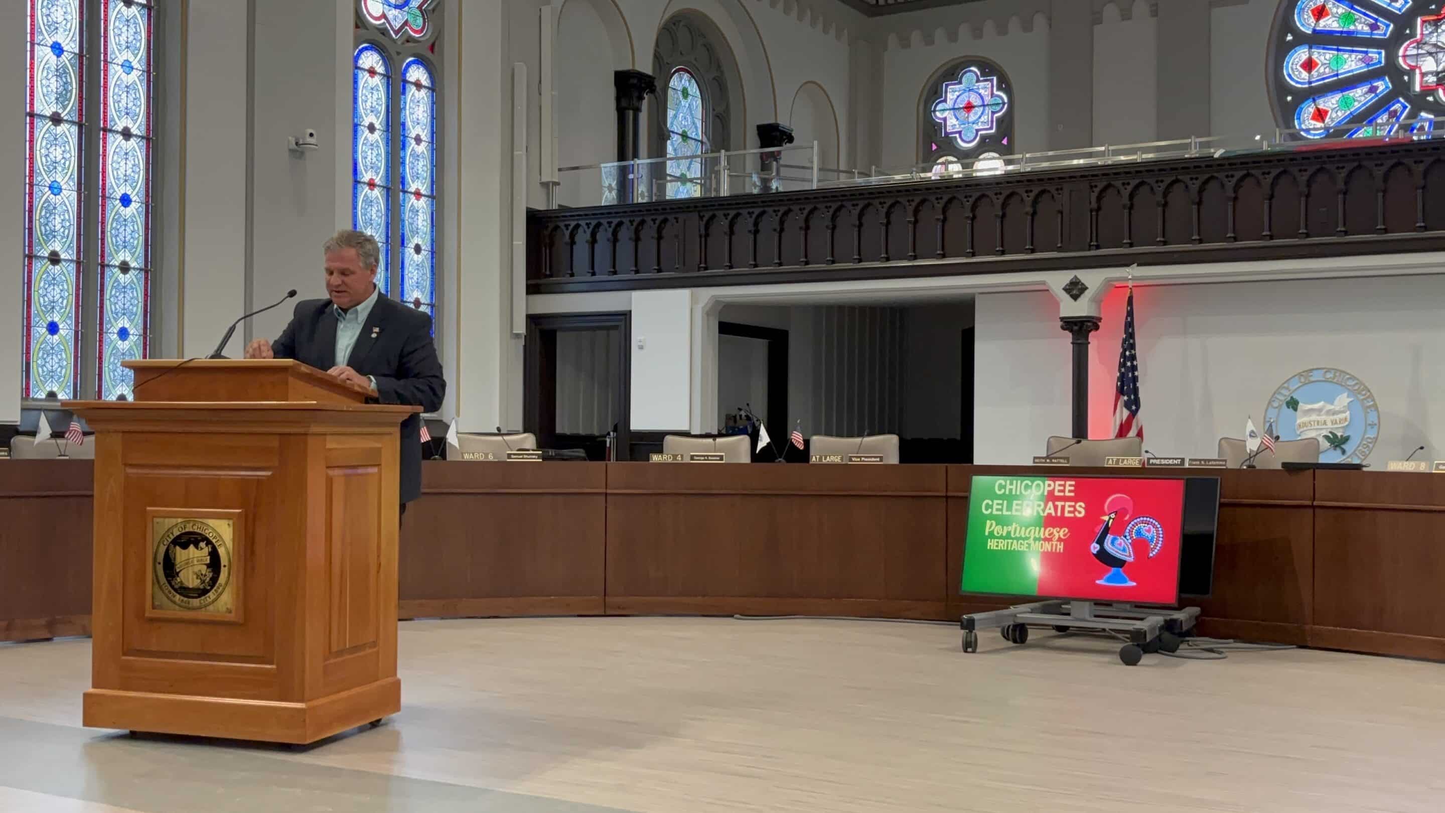 Mayor John Vieau reads a proclamation to recognize Portuguese Heritage Month in the city of Chicopee.