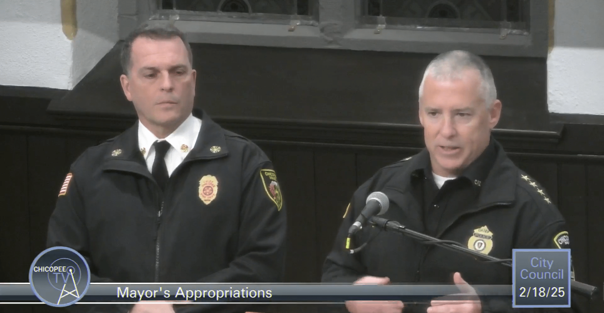 Police Chief Patrick Major (right) and Fire Chief Dan Stamborksi (left) discuss the appropriation for a new instant messaging system in Chicopee.