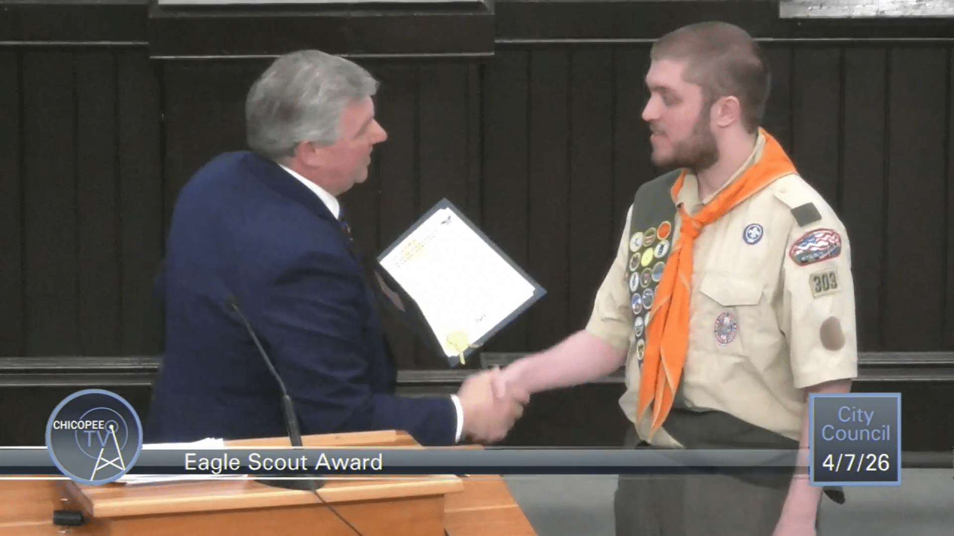 CHICOPEE — Bryce Holmes was recognized at the April 7 City Council meeting by Mayor John Vieau and the city of Chicopee for achieving the rank of Eagle Scout.