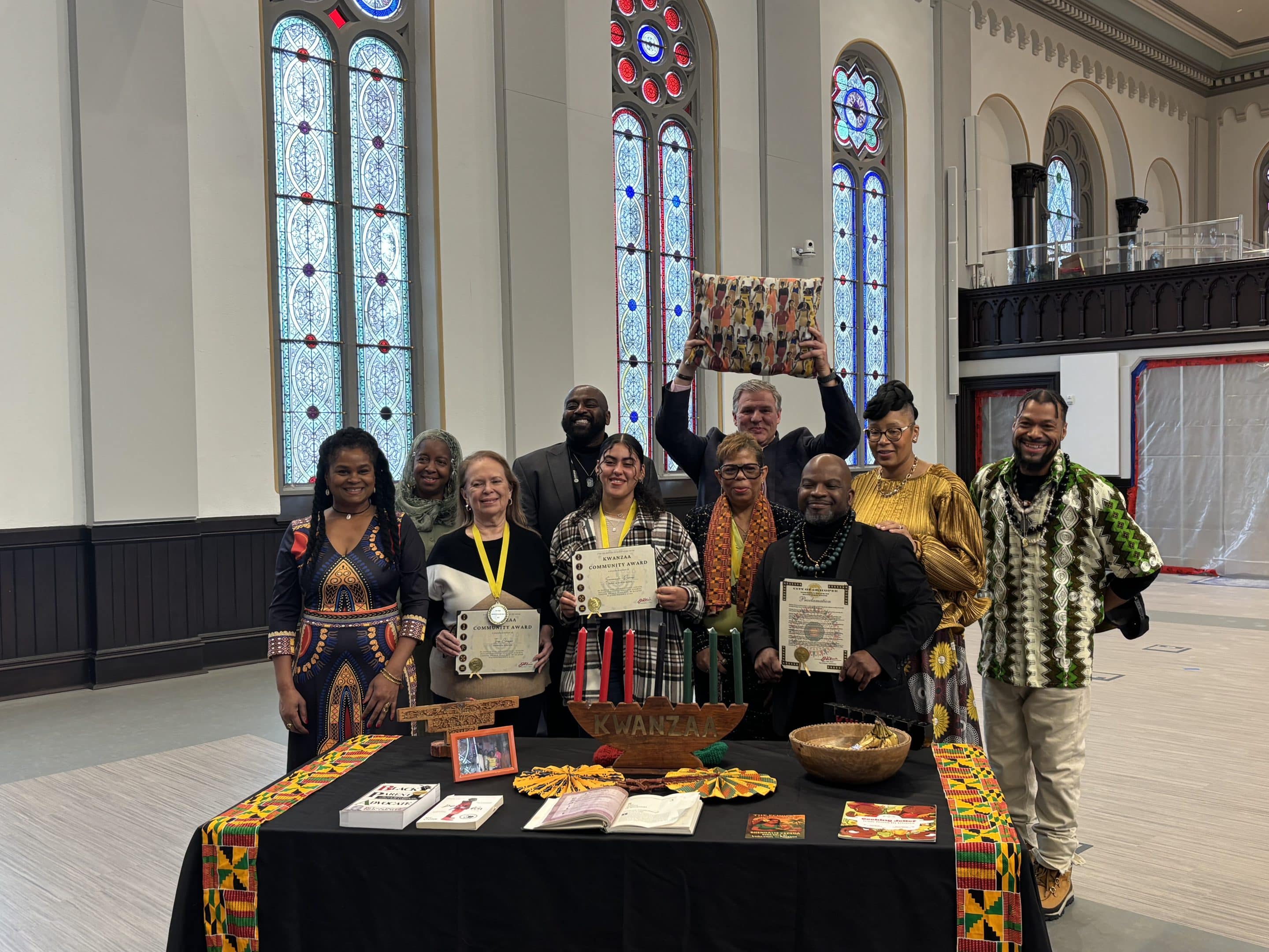 Honorees, members of the Kwanzaa Collective and Chicopee Mayor John Vieau gather to celebrate the fifth day of Kwanzaa in the city hall auditorium.
