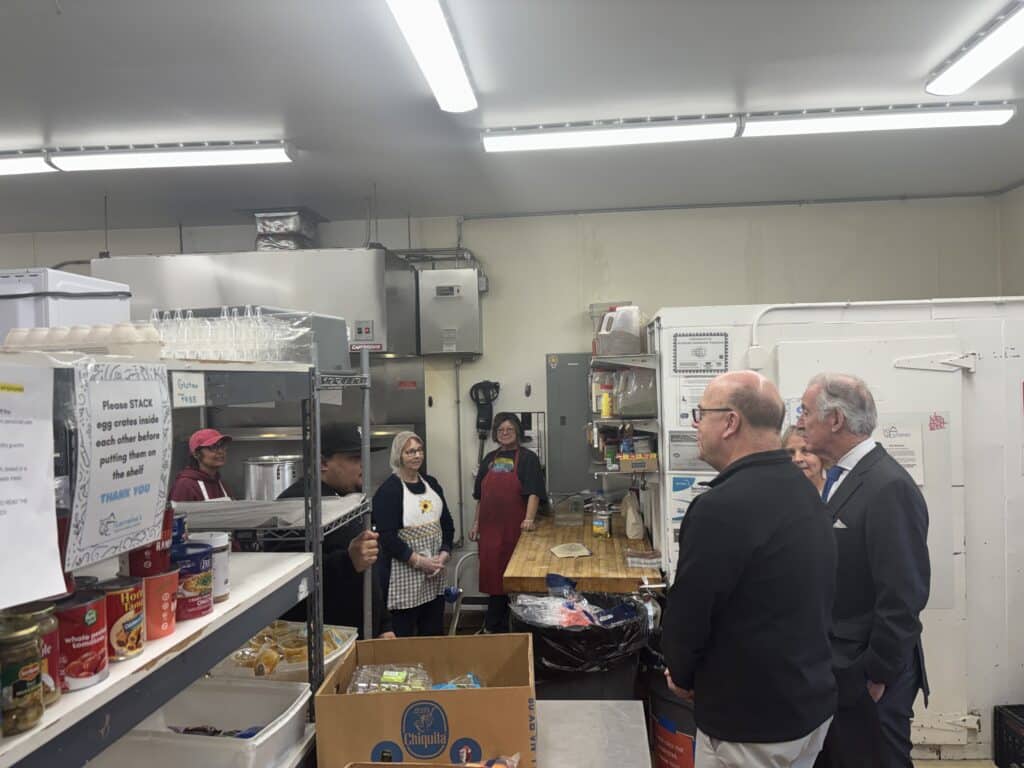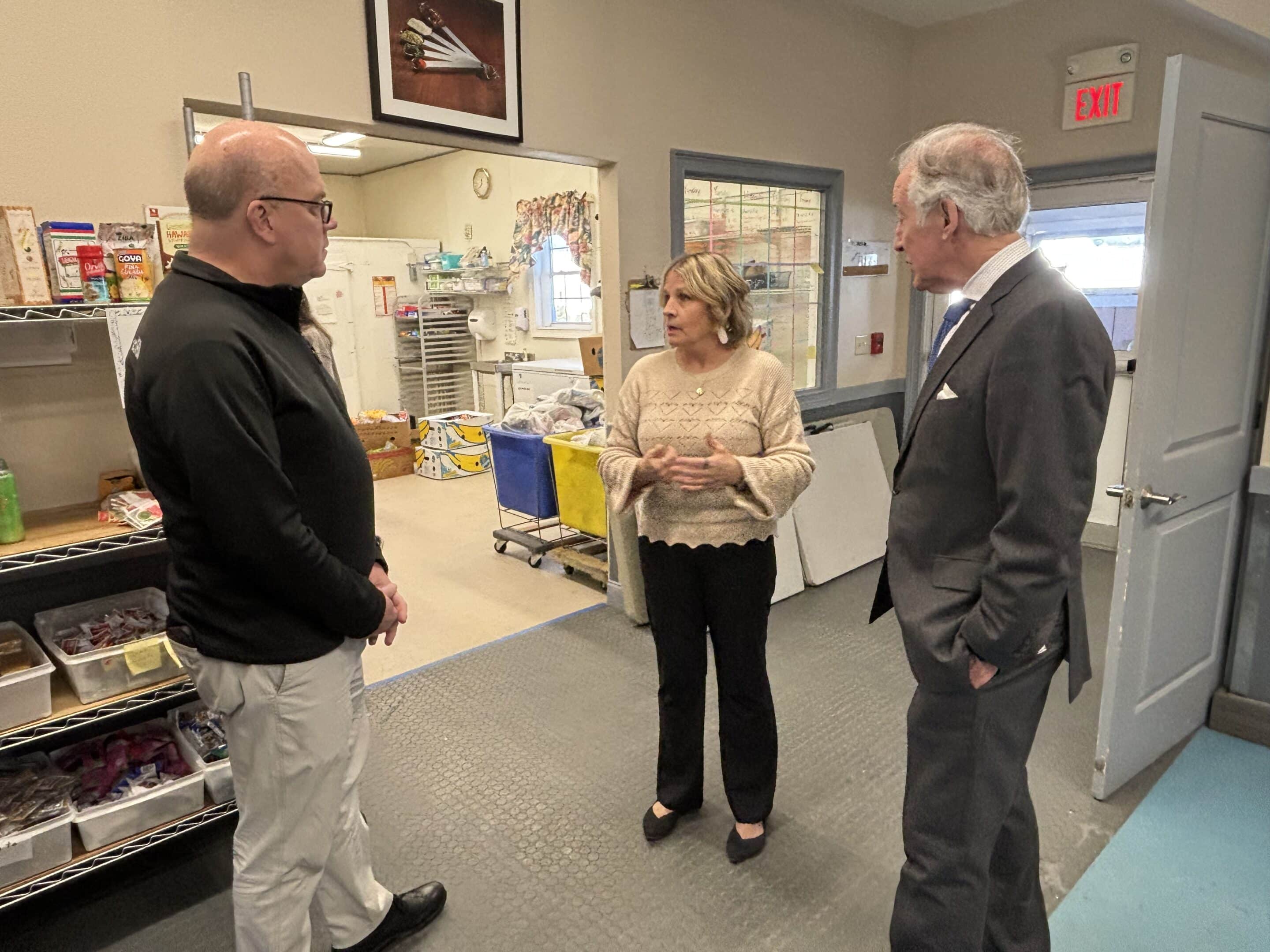 During the visit to the Chicopee soup kitchen, Neal and McGovern joined Kim Caisse, executive director of Lorraine’s Soup Kitchen and Pantry, to help with food distribution and take a tour of the pantry. They also spoke directly to clients about how cuts to federal nutrition programs and high food costs impact access to nutritious food.