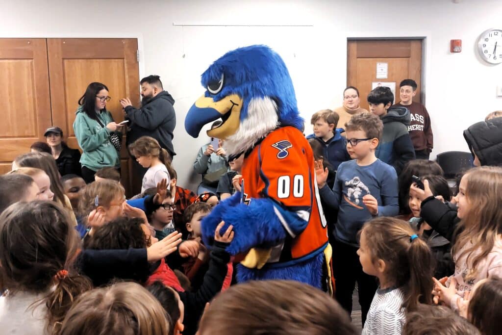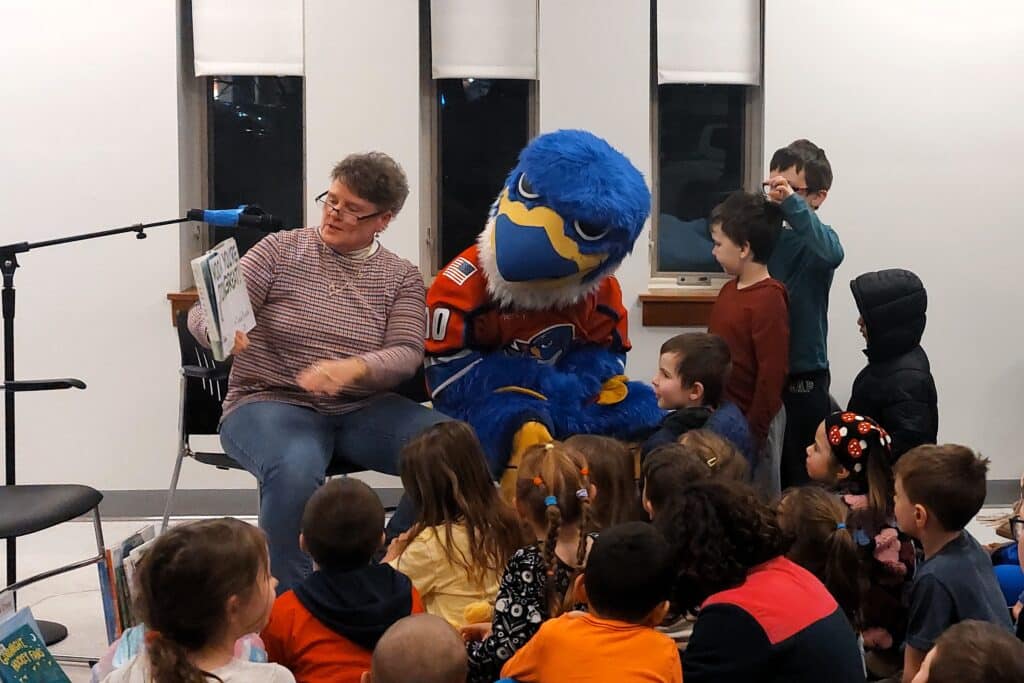 Midway through the event, Boomer, a large blue bird in a Thunderbirds jersey, arrived and greeted the children before sitting next to O’Brien as she read another book. Later, the families took photos with the mascot.