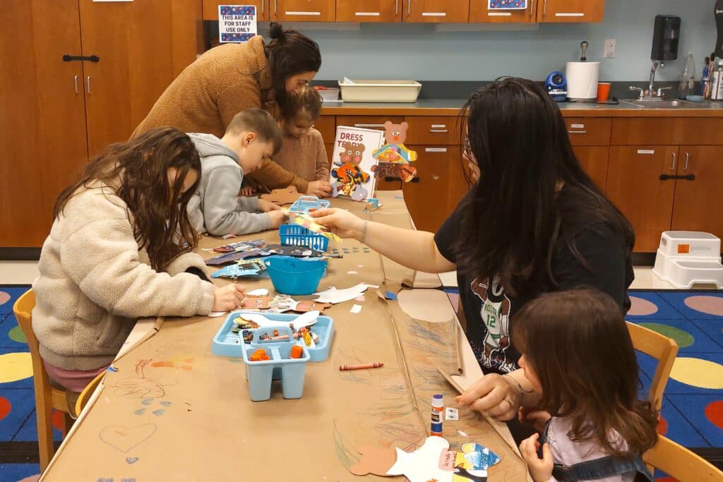 Parents help children with an activity, pasting “clothing” onto paper teddy bears.