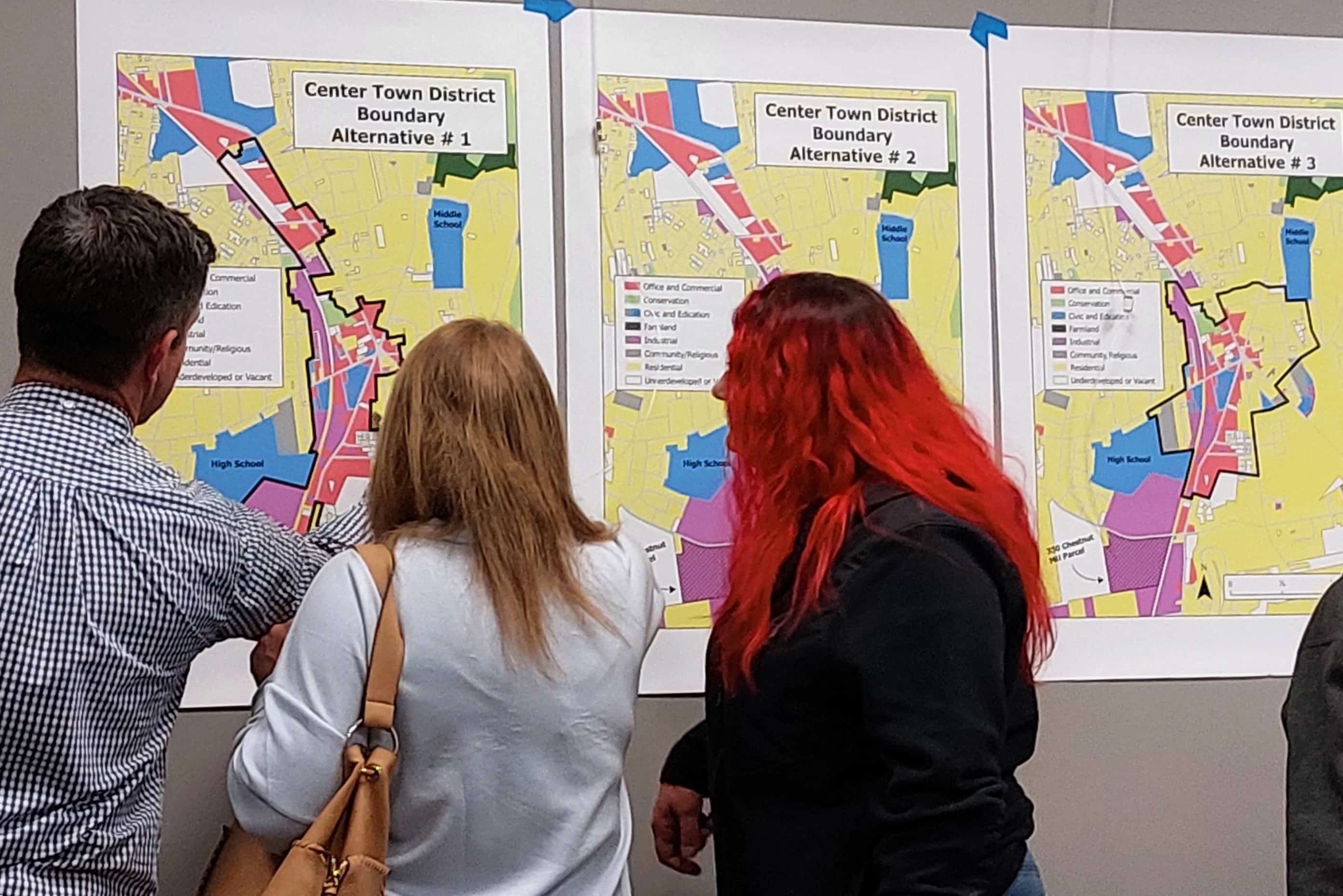 Community members examine potential boundaries for a Center Town District.