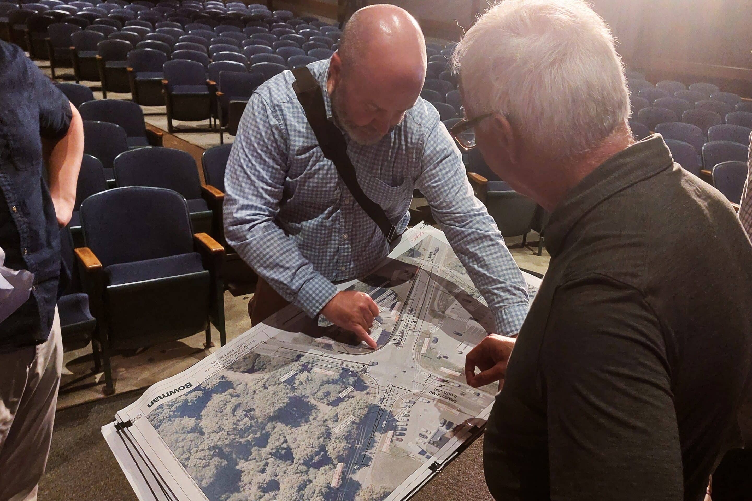 Civil Engineer Jason Adams of Bowman Consulting shows Planning Board Chair Russell Denver how the intersection of Chestnut Street and Shaker Road could be widened.