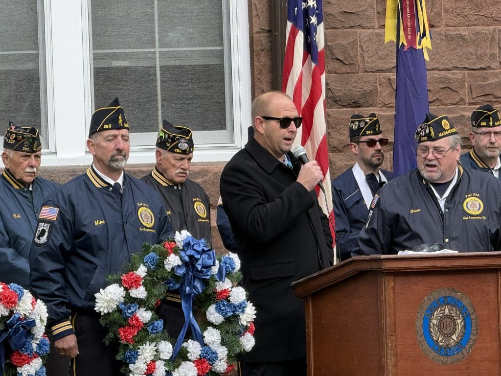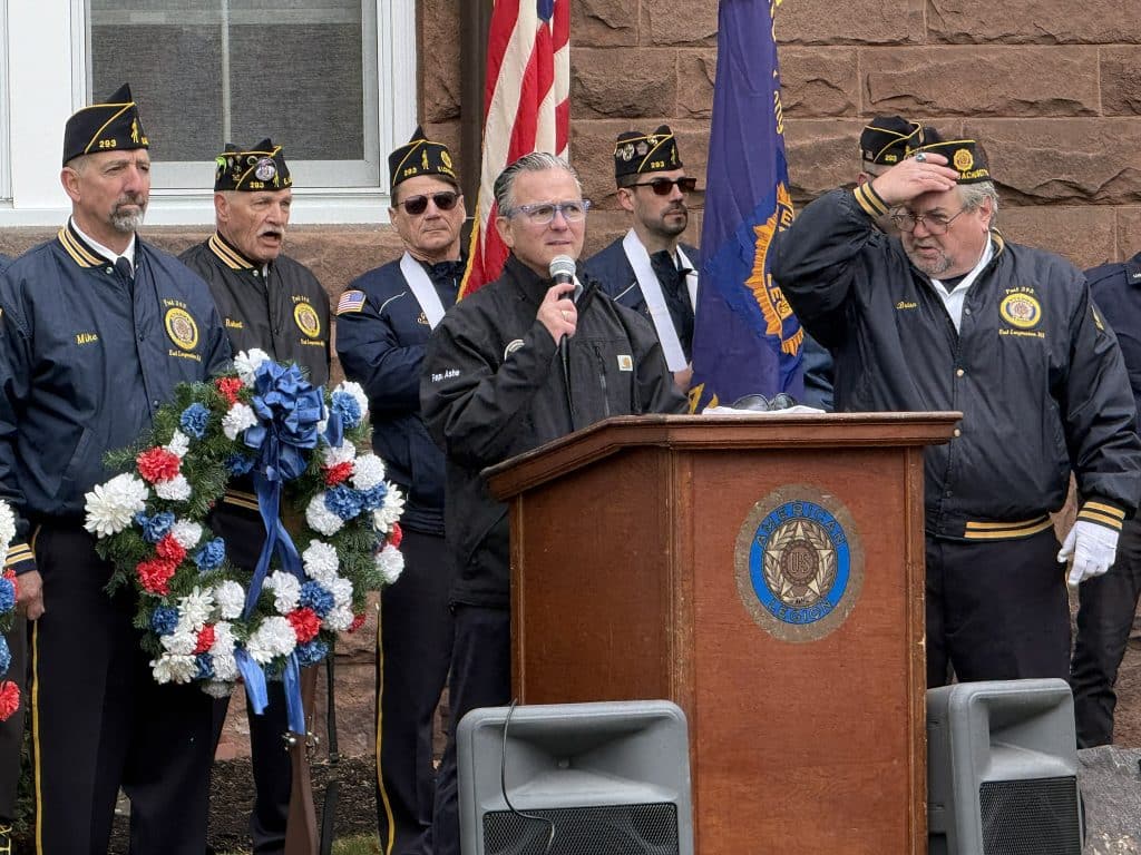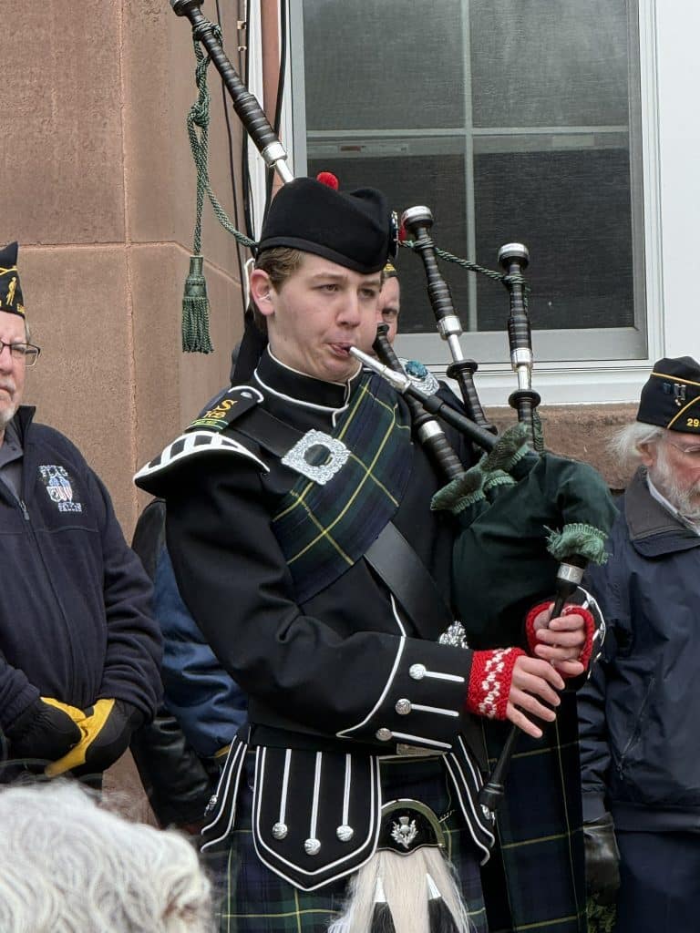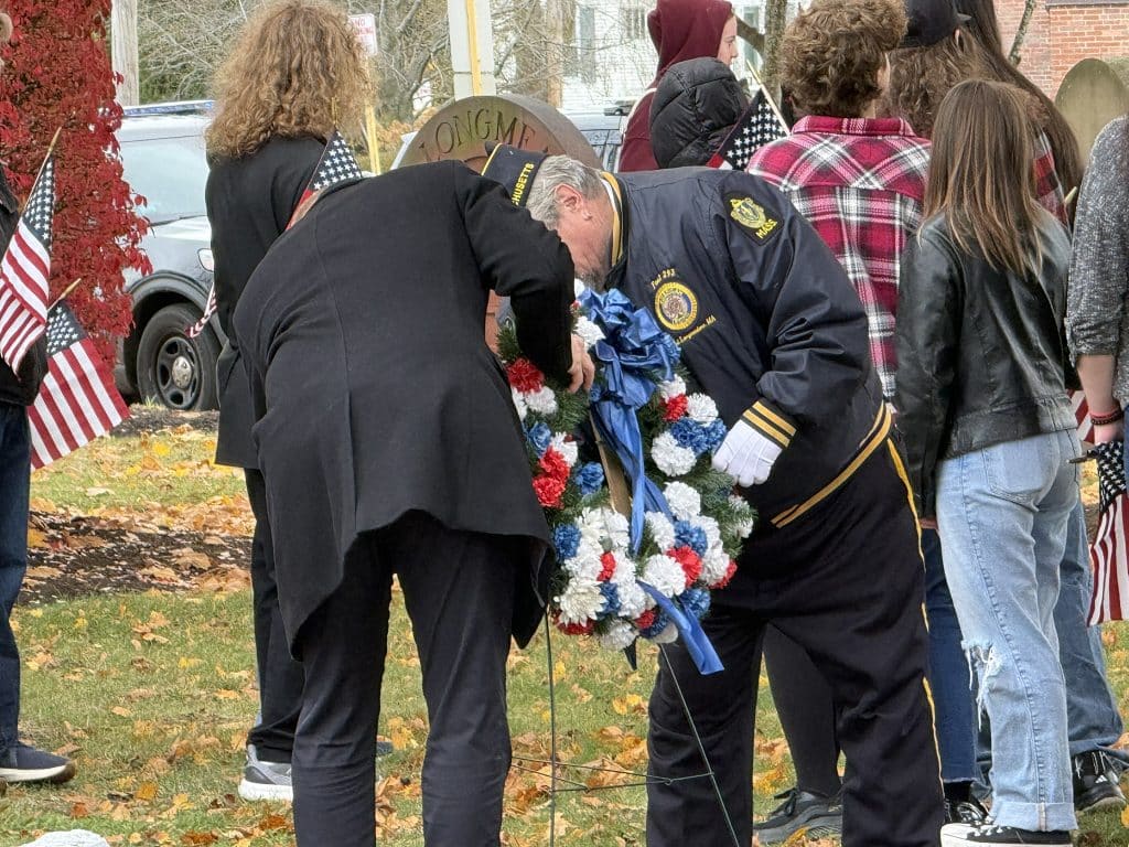EAST LONGMEADOW — Community members gathered at the East Longmeadow Town Hall on Nov. 11 to honor the veterans of Legion Post 293 and all who have served. The kickoff parade started at Legion Post 293 and marched down Maple Street towards Town Hall. Next to where a half-mast flag flew over the memorials honoring all veterans from East Longmeadow who gave their lives in service, Commander of Post 293 Brian Tidlund led the ceremony through an array of speeches and performances. Town Manager Tom Christensen and Town Council President Connor O’Shea assisted Tidlund in the laying of the wreaths before the conclusion of the ceremony.