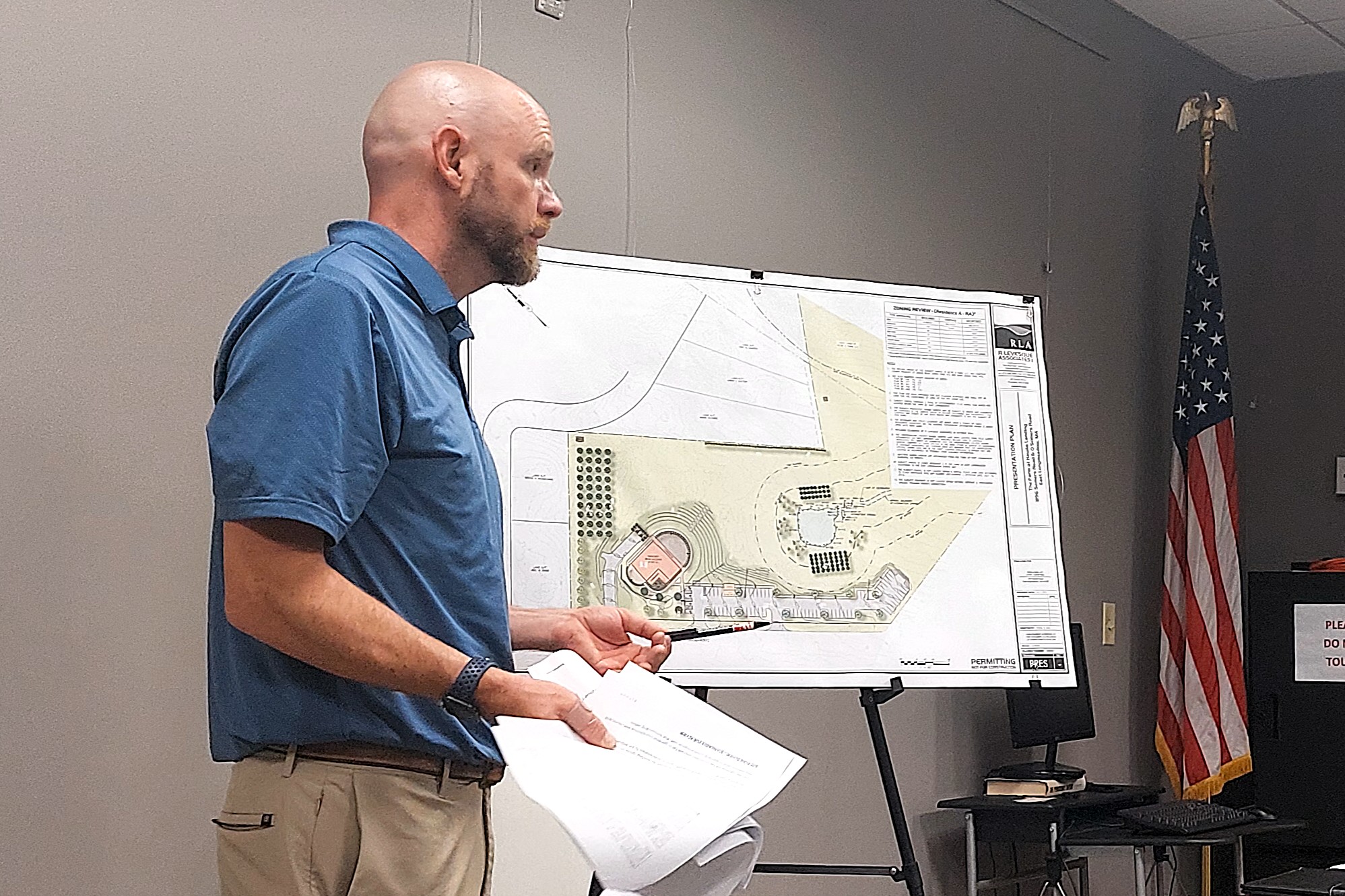 Rob Levesque of R Levesque Associates presents plans for a building at The Farm at Hawks Landing.