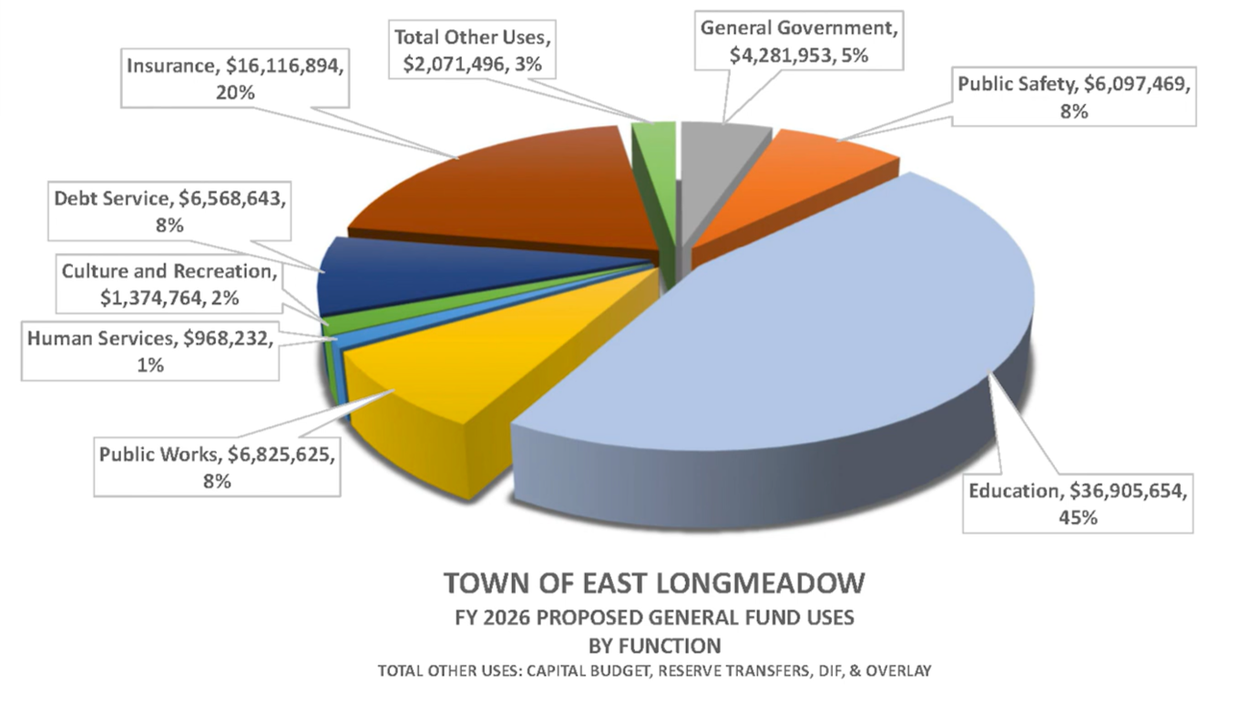 A pie chart depicts East Longmeadow’s fiscal year 2026 expenses, with the largest share going to the School Department, followed by insurance costs.