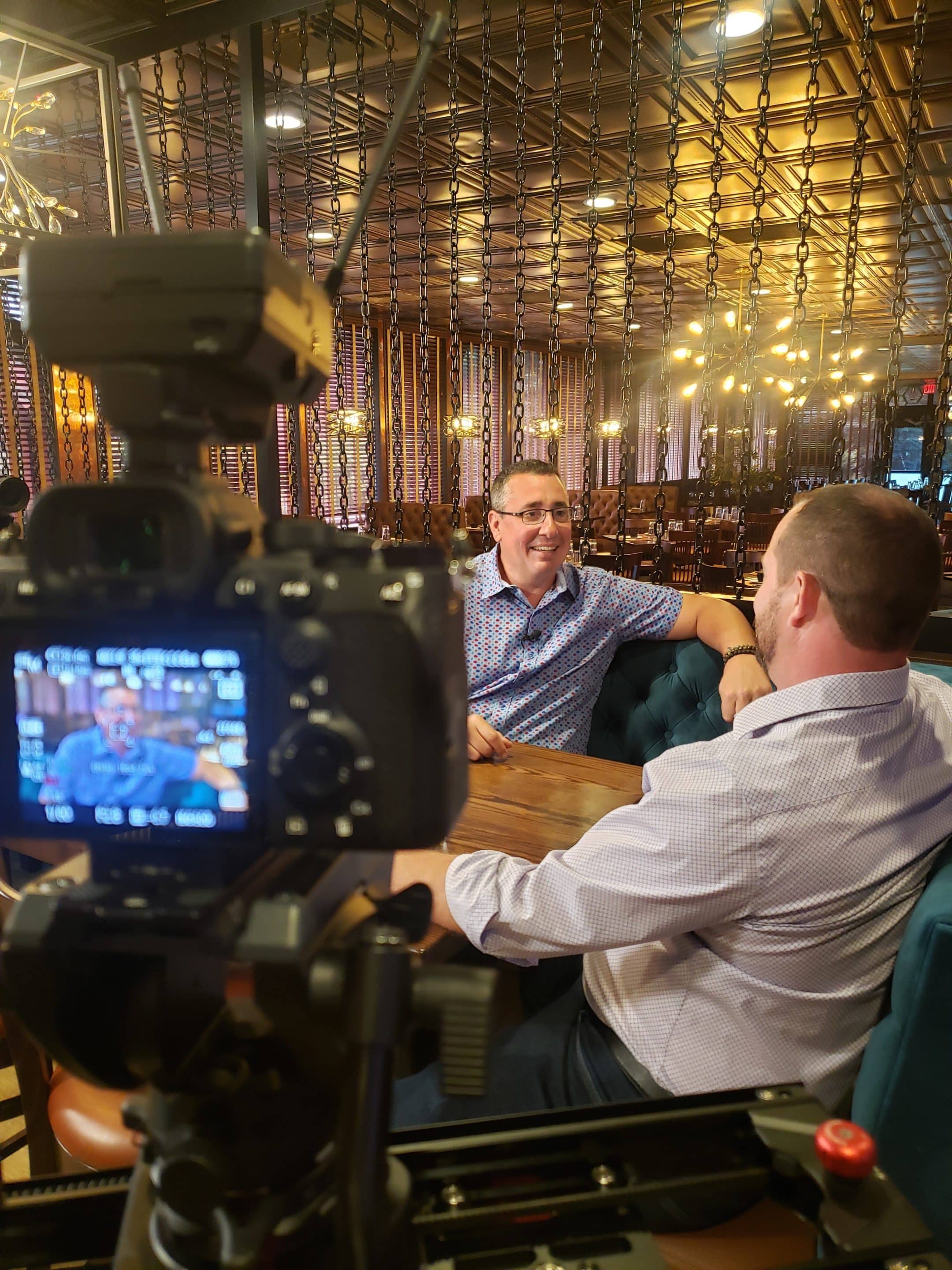 “The Food Explorer” host Bill Collins speaks with a guest on the show during production.