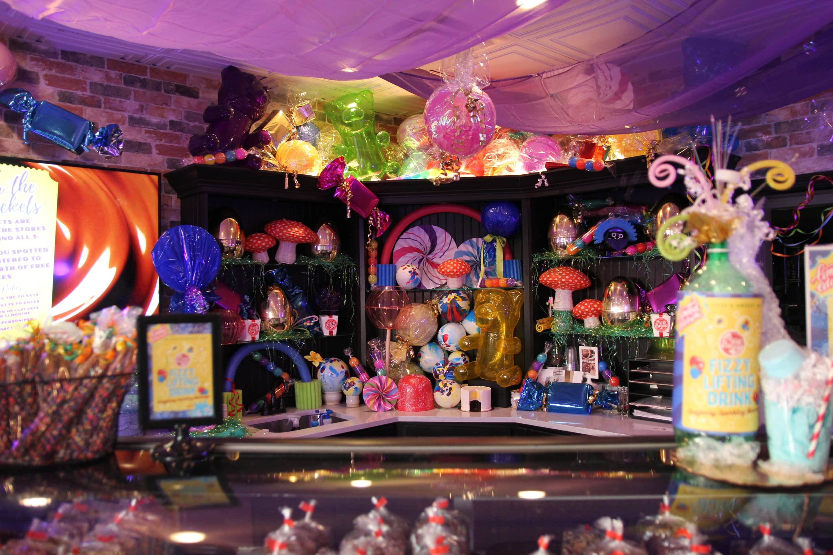 Inside Pete’s Sweets bakery of the Wonka themed experience decked out from top to bottom.