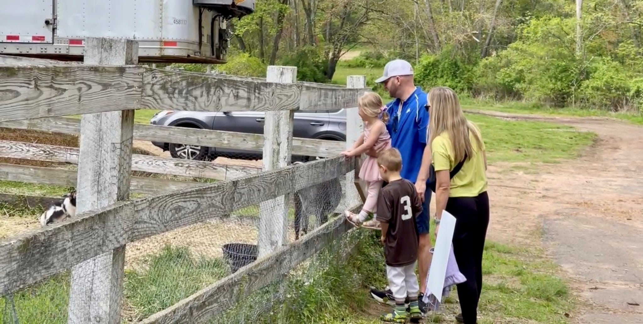 East Longmeadow residents Lisa and Andrew Christiansen, with their children Eddie and June, make some new friends at The Apple Place on Somers Road, which recently opened for the season under new ownership.