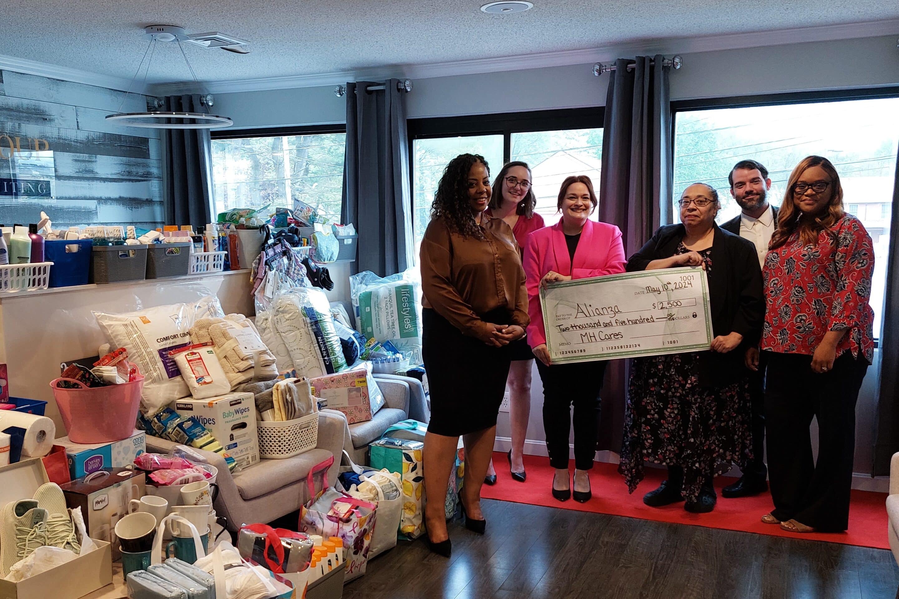 Anthony Saramago, Adeline Miller and Coral Vega, of The MH Group and CEO Nicole Polite, MH Cares Foundation Board Chair Valerie Francis and Alianza DV Services Executive Director Carmen Nieves stand with the donations raised by The MH Group on behalf of Alianza DV Services.