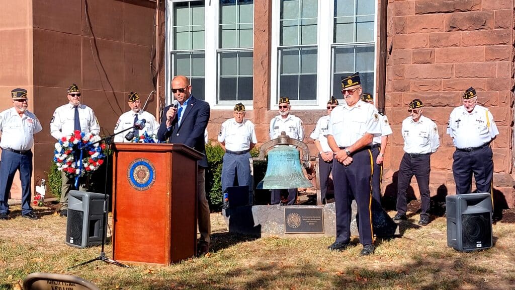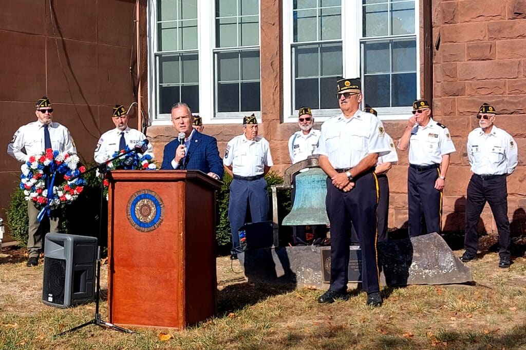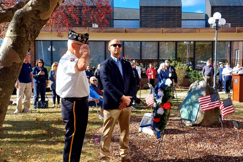State Rep. Brian Ashe (D-Longmeadow) recognized his son, Senior Airman Tiernan Ashe, who was present at the ceremony. He praised Terry Glusko, who was recently named Veteran of the Year by the Springfield Elks Lodge, in part for his efforts to erect a veterans’ memorial in East Longmeadow. Ashe said that while Veterans Day comes once a year, people need to recognize and be grateful to them every day.