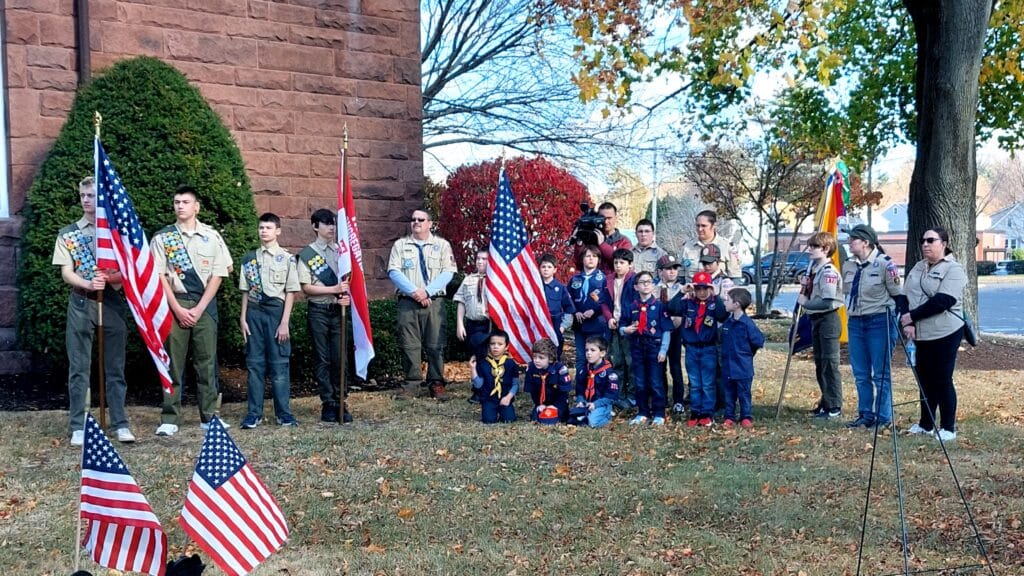 Members of American Legion Post 293, followed by Scouts, march back to the post after this year’s Veterans Day ceremony.