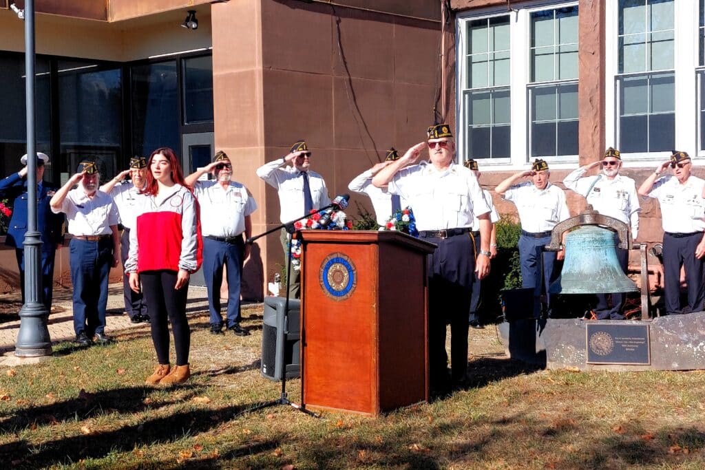 After the Pledge of Allegiance, led by Scout Troop 179 and Cub Scout Troop 272, East Longmeadow High School student Emma Roffe sang “The Star-Spangled Banner” and, later, “God Bless America.” Fellow students Emanuel Garcia and Michael Lonczak sounded taps on the bugle.