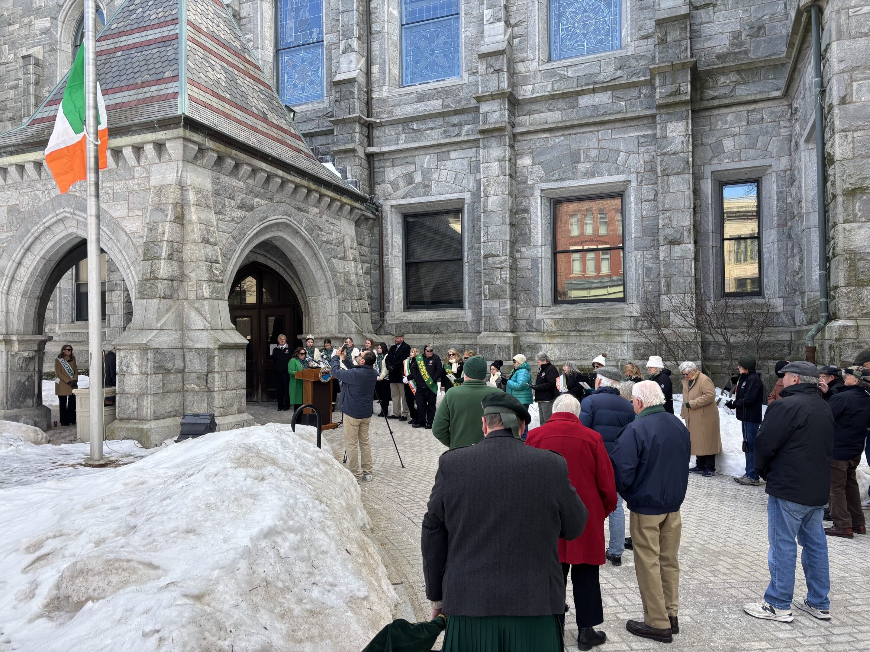 The Holyoke community gathers to kick off Irish Heritage Month with a flag raising at City Hall on March 2.
