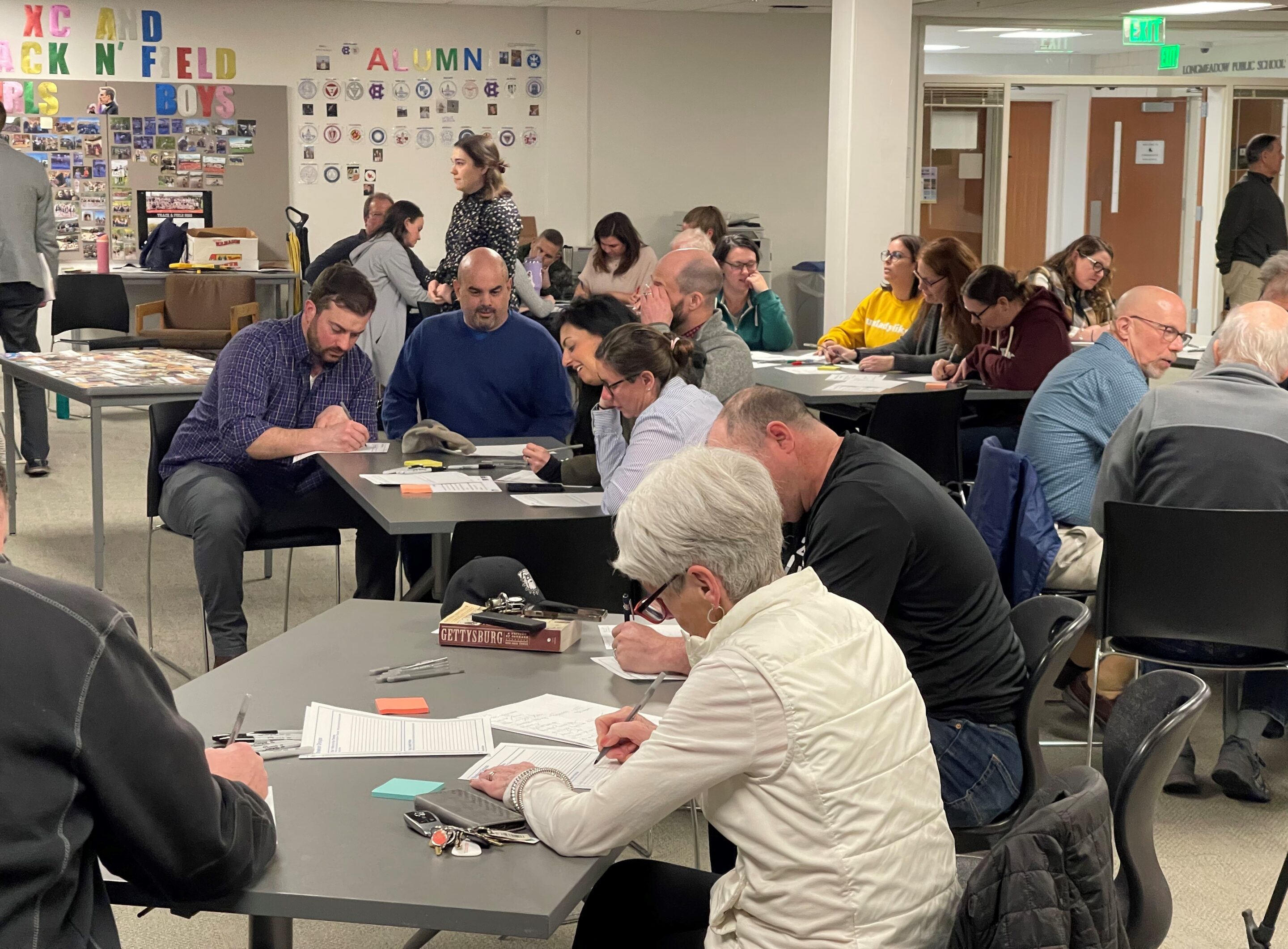 Community members take part in a table top exercise during a March 27 visioning session looking at options for Longmeadow’s two Middle Schools.