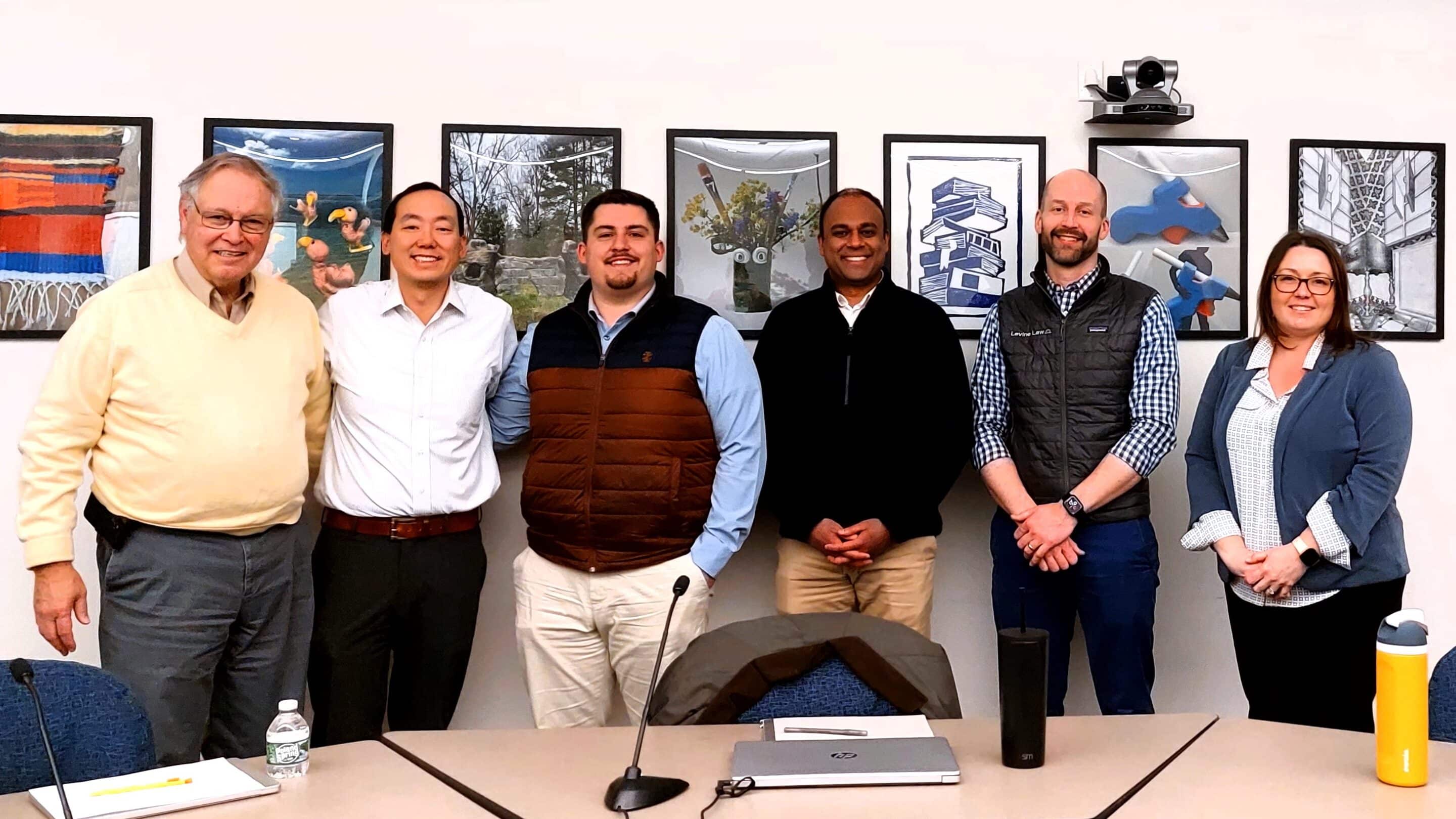 Newly named Assistant Town Manager and Planning and Community Development Director Michael Barbieri stands with Town Manager Lyn Simmons, Select Board Chair Vineeth Hemavathi, and Select Board members Mark Gold, Andrew Lam and Josh Levine.