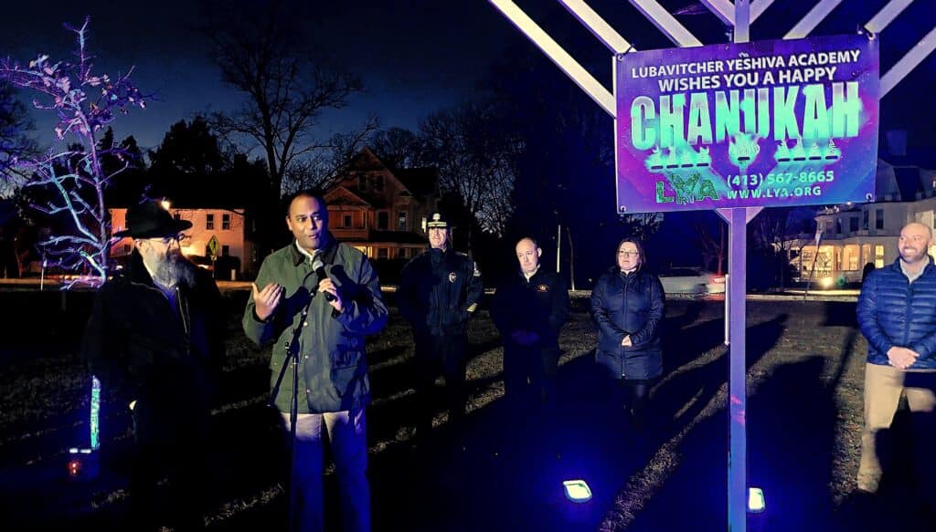 State Rep. Brian Ashe and state Sens. John Velis and Jake Oliveira attended the ceremony. Oliveira commented, “The Festival of Lights,” as the holiday is known, “really shows the power of this community.”