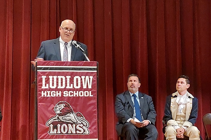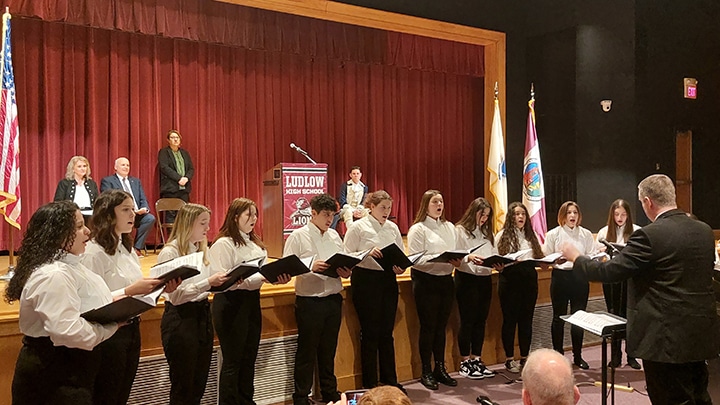 The Ludlow High School Chorus began the ceremony at the school by singing “The Star-Spangled Banner,” followed by a welcome from Principal Lisa Nemeth.