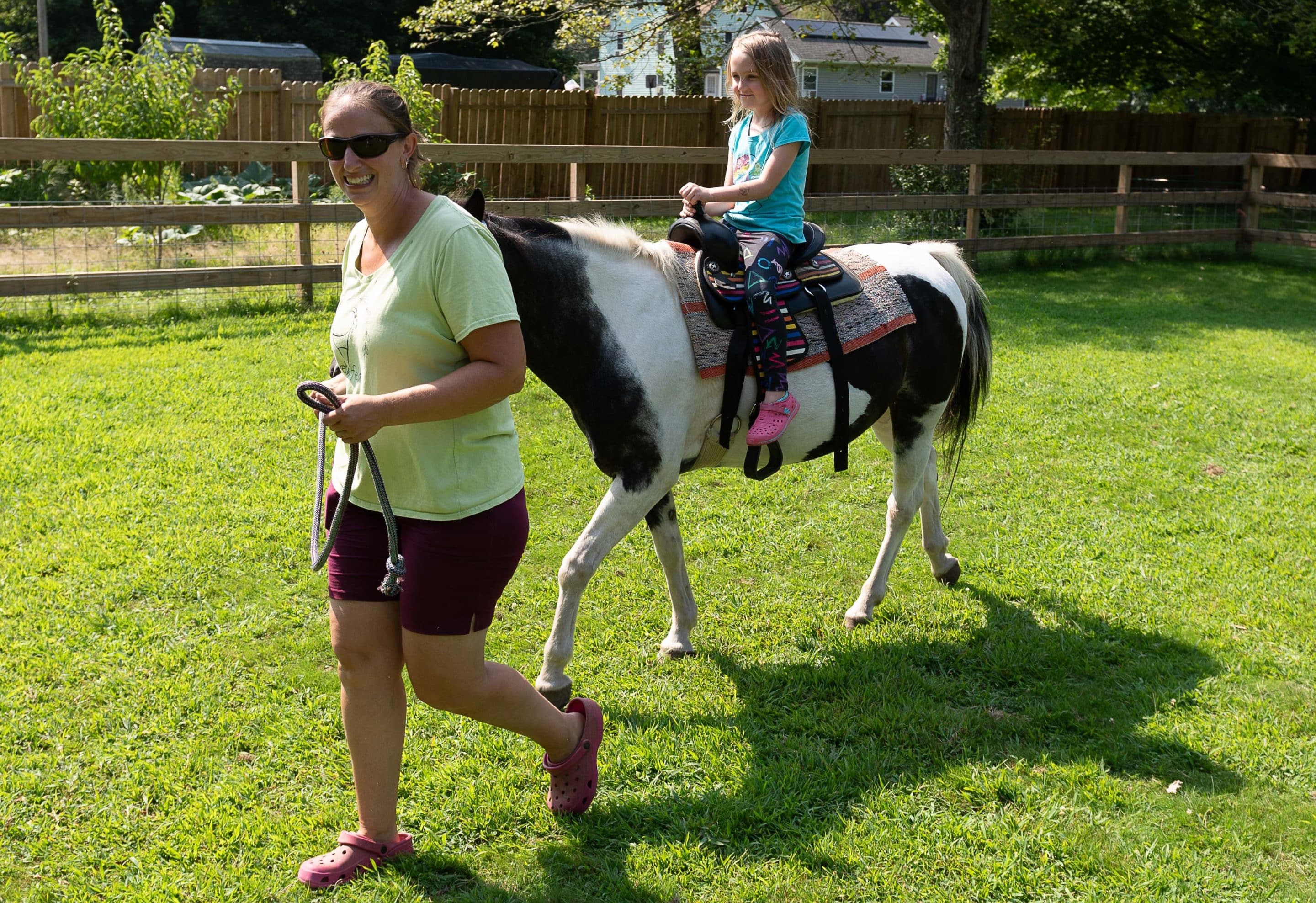 Emma Drenen enjoyed a pony ride during last year’s Farm Day event in town. She is being led by Lindsay Hale, owner of Firefly Fields, in Southwick.