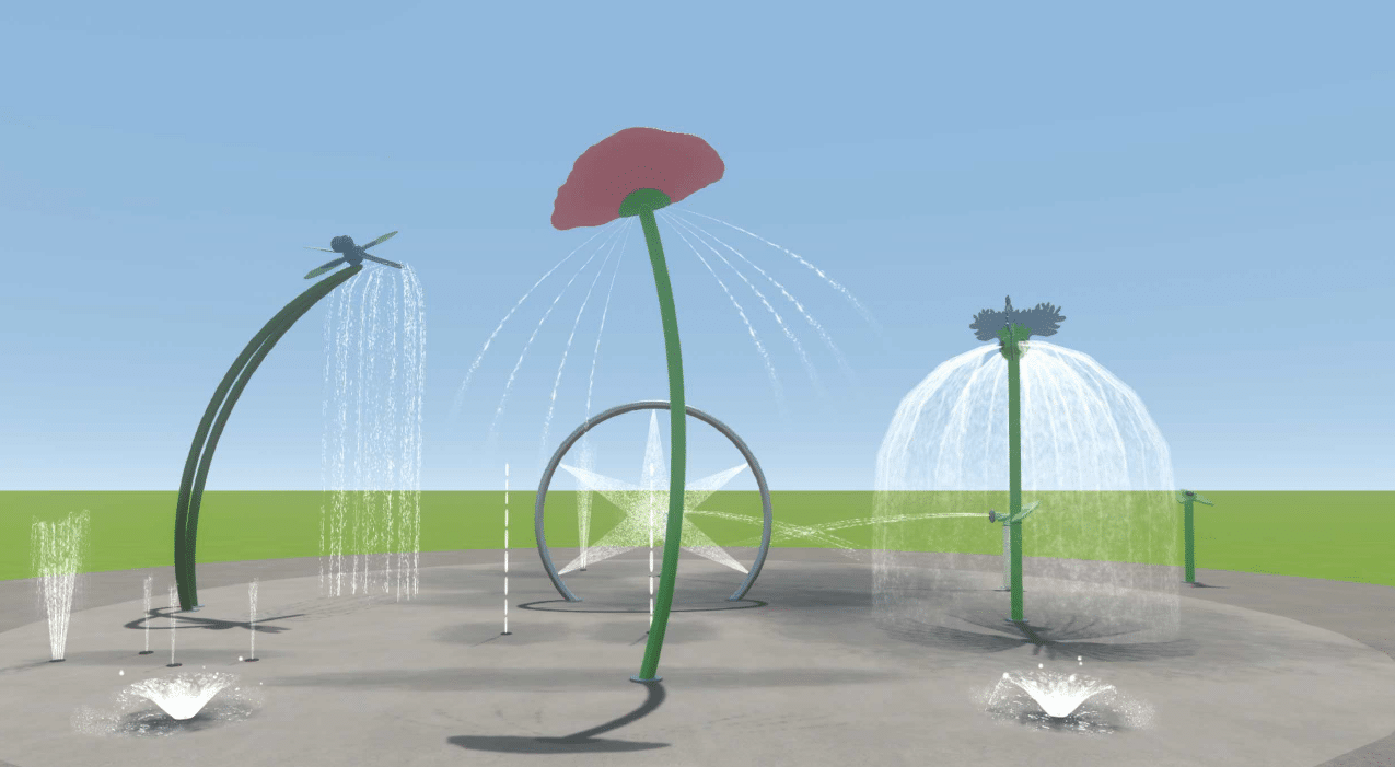 The splash pad will have three towers that rain down water, and a large ring, big enough for children to walk through, that would have water spraying inside from the ring’s edge. There will also be two tulip-shaped fixtures spraying up from the park’s deck, and two “pop-it” sprayers.