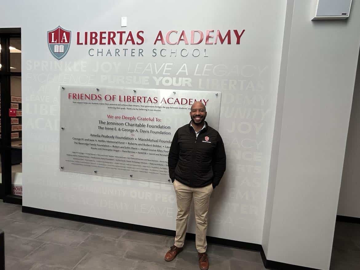 Libertas Academy Executive Director and Founder Modesto Montero-Forman stands in front of the school’s sign inside its new state-of-the-art building at 262 Liberty St.