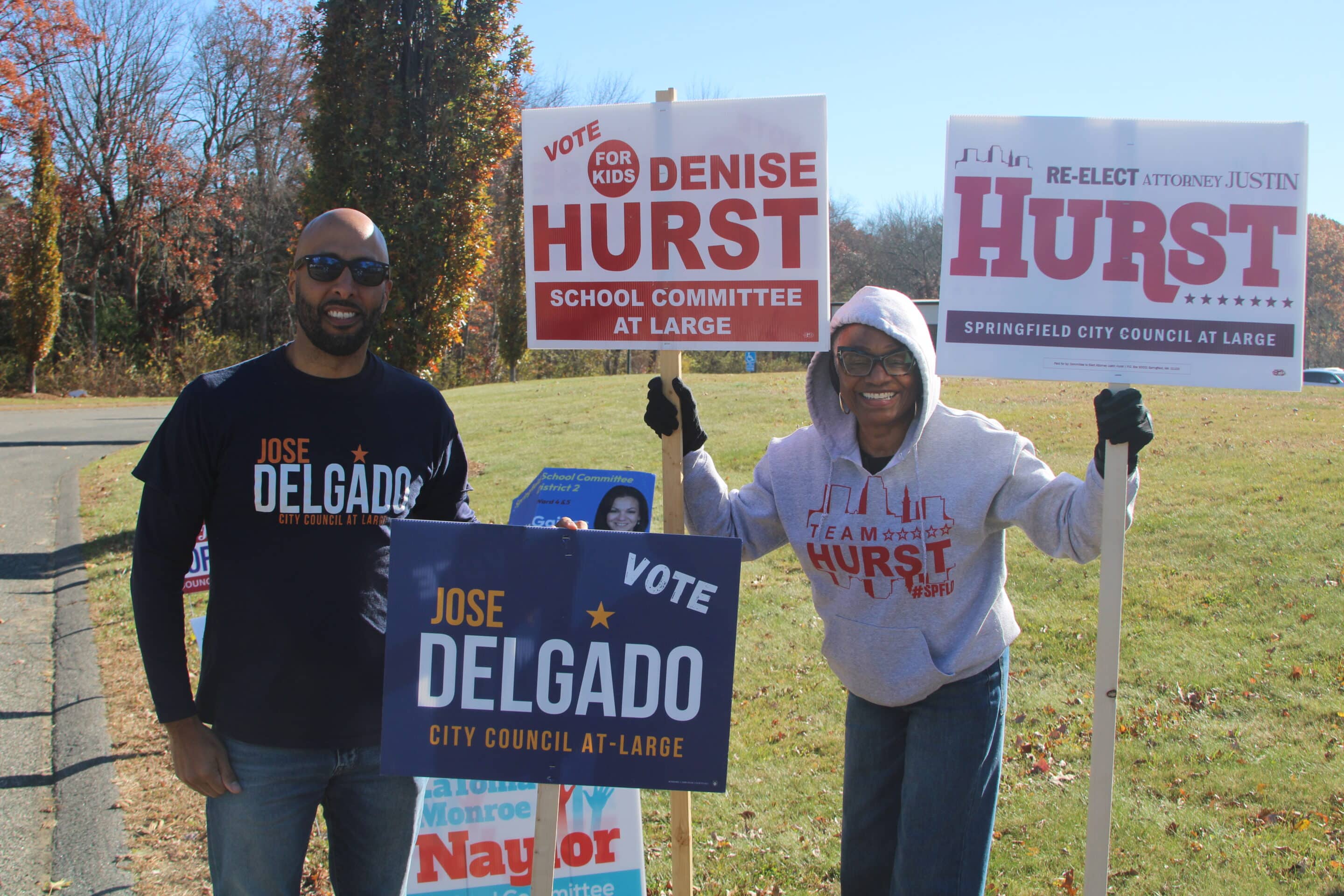 City Councilor Jose Delgado and Maxine Brown stand out on Parker Street in Springfield in front of the polling location at the Clodo Concepcion Community Center in Ward 5. Delgado, an at large councilor, was the top vote-getter in his reelection bid.